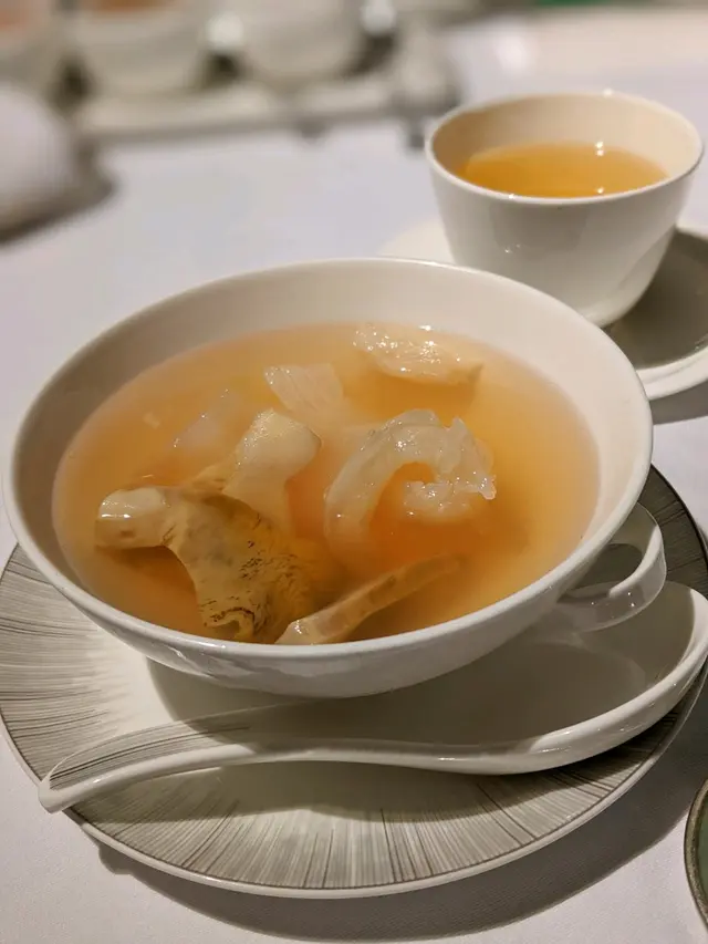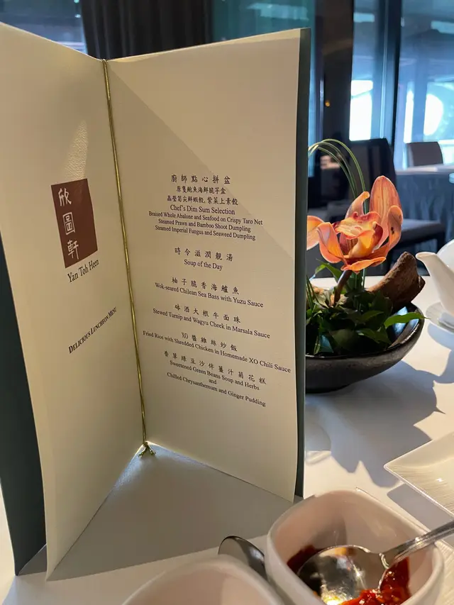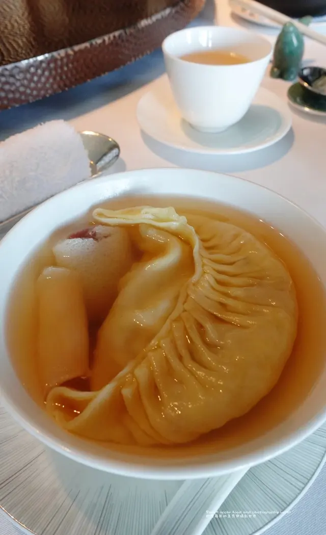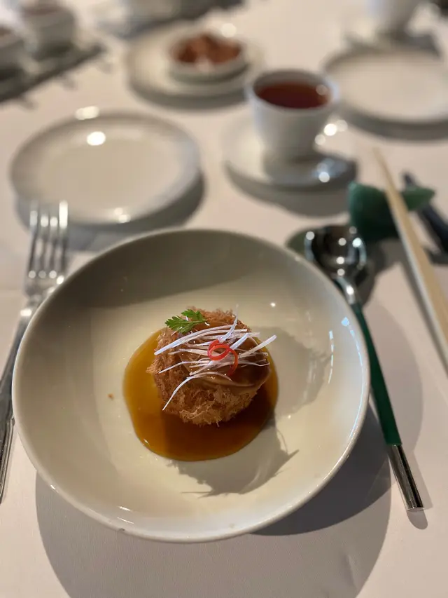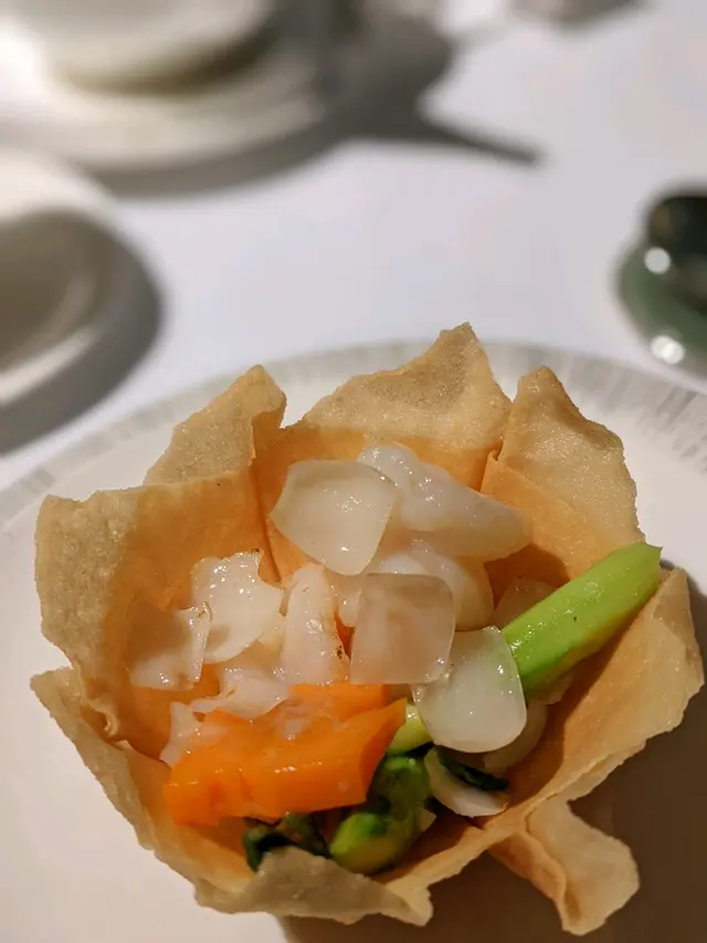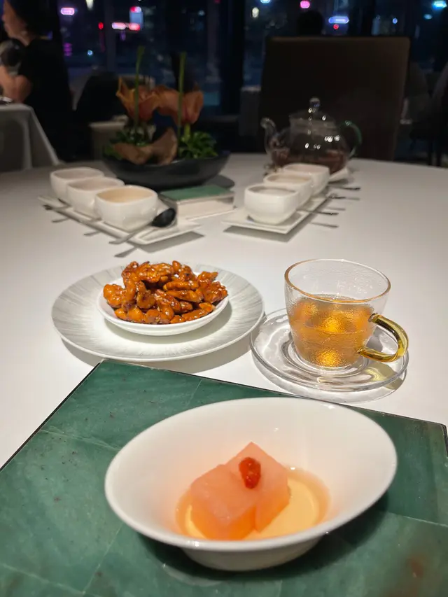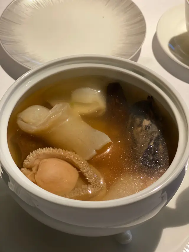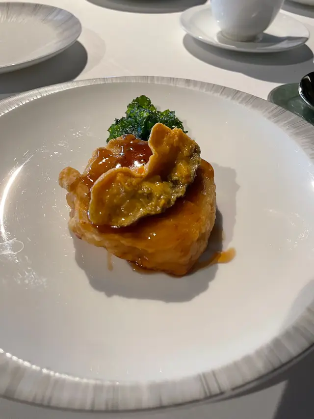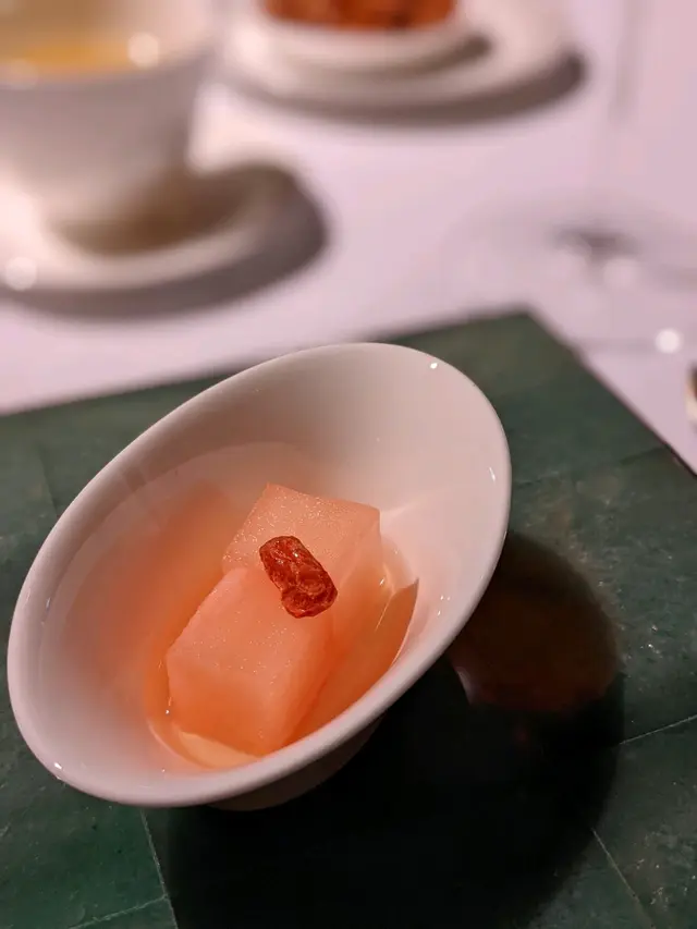 前菜琥珀合桃都絶不馬虎,香脆少甜,合桃再加芝麻既香味,實在係太香脆吸引。要不斷提醒自己唔好食咁多,因為個套餐有太多嘢食,唔好太快填飽個胃。另一前菜係醃西瓜,炎暑好滋味。正式上第一道菜,係雞絲海蜇,擺盤精美,夜光杯盛載,好吸睛。花膠響螺湯,湯底清甜滋補,仲有大大件花膠同埋響螺。鮮百合明蝦球脆釀鮮蟹蓋,大大隻,外殼炸得剛剛好帶點焦脆,蟹蓋內釀滿白汁洋蔥蟹肉加點炸蟹拑,又係炸到剛剛好,啖啖肉大滿足蒜片雞縱菌爆石窩和牛,和牛肉嫩雞縱菌鮮美,熱石窩上枱,蒜香四溢好惹味竹笙扒上素,又可以再清一清味蕾迎接下一道菜魚香帶子脆香苗,成功令唔好葱既我眼前一亮,第一次覺得青葱係整道菜既靈魂,完美提升香味。青葱帶子脆米淋上熱魚湯,非常出色。香芋燉鮮奶, 雖然已經食到好飽,仍然唔捨得放棄。但竟然,仲送一個甜品架...究竟個胃有幾大先食得晒個餐😂😂😂*Dining city restaurant week tasting menu**如果繼續有dining week就好嘞🤤…查看更多