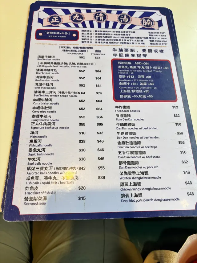 正九清湯腩 (常安樓) (油麻地) 网址: https://s.openrice.com/QrLS0RqGB00 地址: 香港油麻地文明里11-13號常安樓地下1號舖 电话: +852 93333268