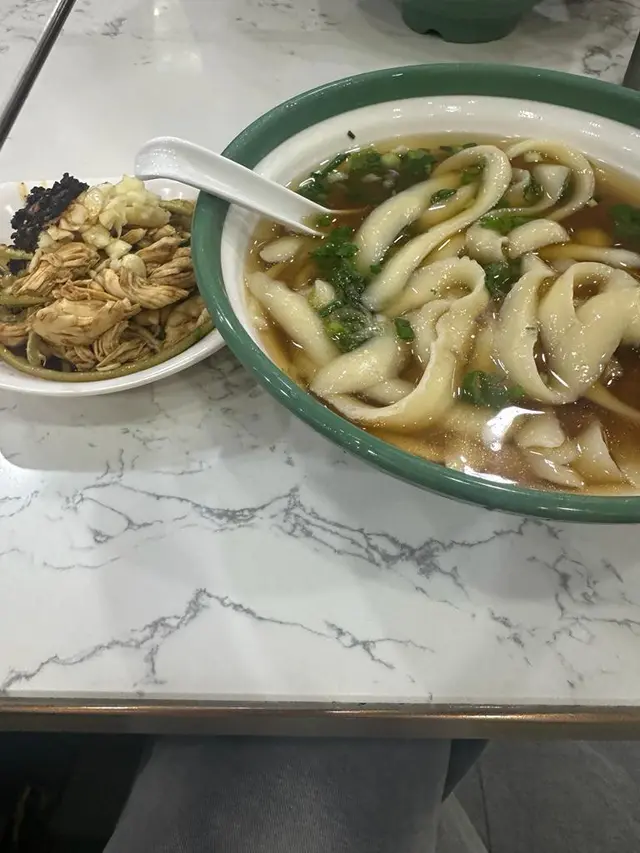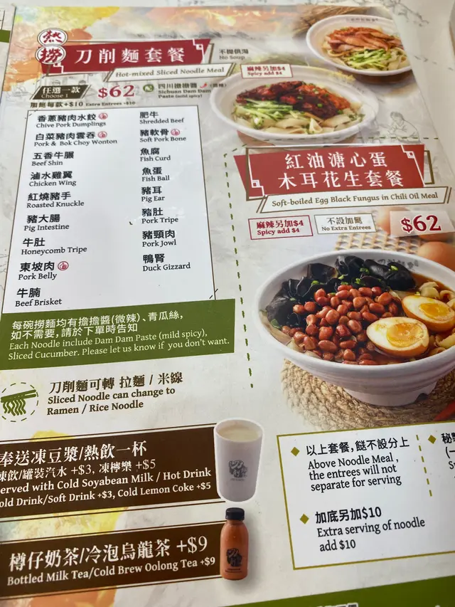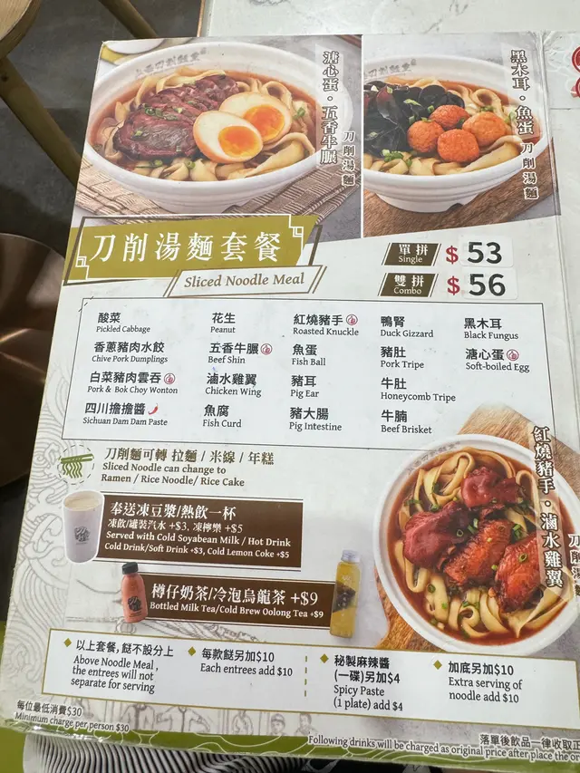 原來荃灣食開嗰間刀削麵,葵芳都有分店。麻辣東坡肉刀削麵套餐東坡肉有一大兩細,厚切,肥瘦比例大約三七。煮得十分入味,肥位當然就梗係肥啦,但咬落唔會太過油膩,瘦位夠腍,雖然唔係軟嫩,但一啲都唔嚡亦唔痴牙。麻辣十分惹味,麻度足辣味濃,再加埋生蒜粒,更加重口味(如果生蒜粒切得再細粒啲會更好)。刀削麵十分煙韌,好好𡁻,因為係人手削,條條粗幼長短都唔同,口感一流,同機製真係無得比。湯底清得嚟又夠哂味,飲咗大半碗湯,事後都無特別口渴。套餐包豆漿一杯,豆味唔多,甜度正常,味道普通。…查看更多