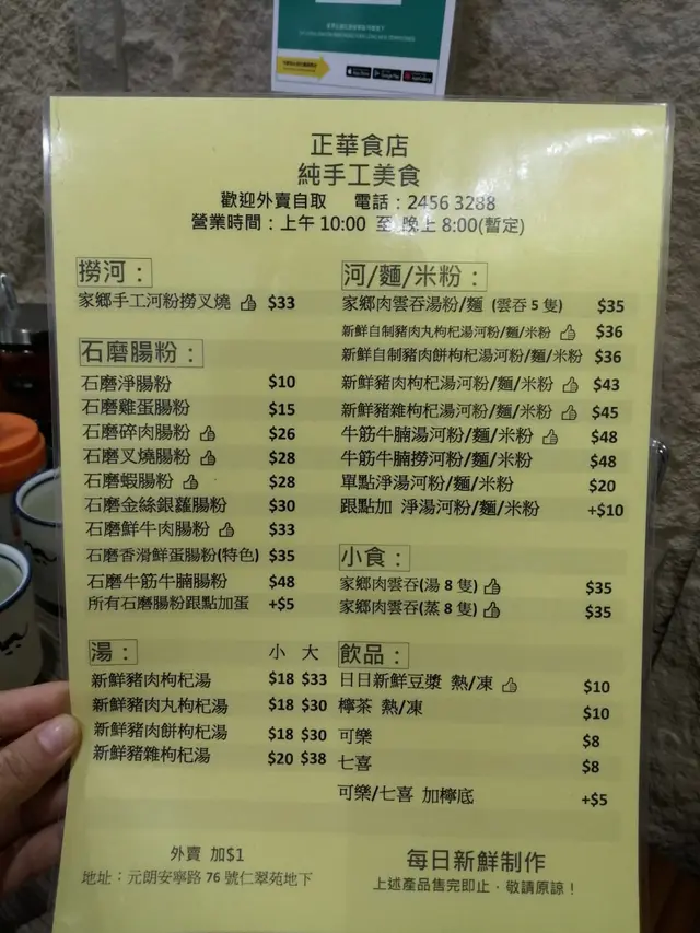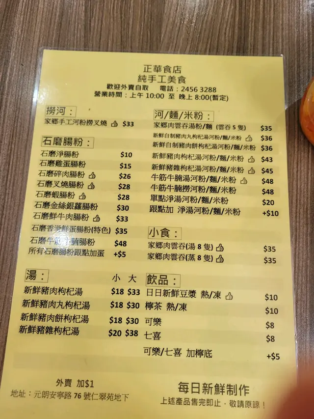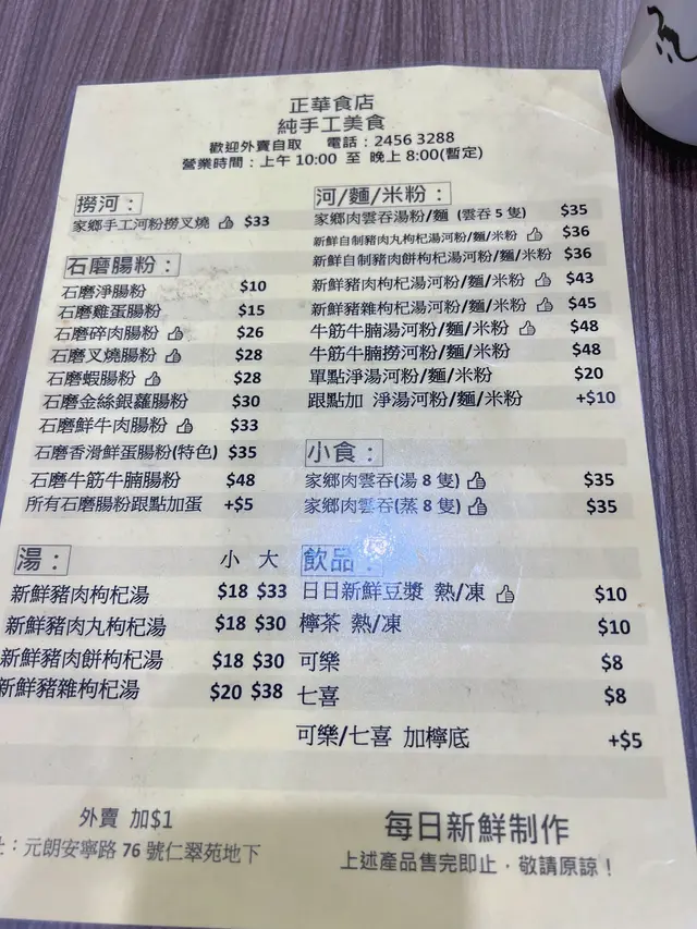 誠意小店 charlesfoodrecord等级42022-11-04177 浏览 关注 深宵餓蟲,巧遇石磨腸粉,不假思索,坐下暖肚。點餐才發現,已過收店時間,老闆仍熱情招待,為深秋添暖。石磨碎肉腸粉 $26石磨腸粉見少買少。醬油用心, 冬菇絲和醃菜很入味, 為腸粉畫龍點睛。食材用上花生油,很難不惹味。 一碟九件,超值。豬肉丸枸杞湯河粉 $36跟豬肉餅一樣,形狀不同而已。一碗有六粒,以為自己眼花。豆漿一小枝 $10喝得出豆漿有自家製的味道。全部食品、湯味道清淡。 我的好夜宵,肚皮沒有擔子。 目前只收現金。…查看更多+ 1以上食记乃用户个人意见 , 并不代表OpenRice之观点。赞好分享誠意小店 正華餐廳 https://s.openrice.com/QrLT04Jj600检举 张贴 评分4味道4环境4服务4卫生4抵食用餐途径堂食