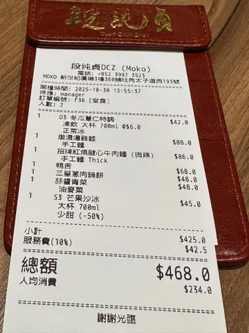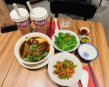 朋友和我喜欢吃台湾菜,听闻台湾过江龙<段纯贞>是一间很不错的台湾餐厅,于是与朋友来到位于旺角MOKO新世纪广场<段纯贞>吃晚餐。餐厅位置很多,环境舒适。我们看了餐牌后,点了一份蒜酱油麦菜、两款小菜 - 盐酥鸡和三星葱肉锅饼、两份主菜 - 招牌红烧腱心牛肉面和台式肉燥饭及两杯饮品- 热茉莉绿茶和热紫香芋泥特调。蒜酱油麦菜~油麦菜份量多,足够两人吃。翠绿油麦菜很爽甜,蒜酱味又香浓。盐酥鸡~盐酥鸡炸至外层酥脆,仍保留嫩滑肉质,九层塔又炸得香脆,好像吃薯片。三星葱肉锅饼~三星葱是宜兰特产,喜欢吃葱的粉丝必选这道小菜。煎至金黄酥脆薄饼皮,包著香气四溢的三星葱肉馅,真是很好吃。招牌红烧腱心牛肉面~牛骨熬煮数小时的汤底非常浓郁,香浓药材味,禁不住一口接著一口喝。三件厚切腱心牛肉,肉质软腍,肉香醇厚,非常入味。选了手工面,外形似刀削面,面质却又比刀削面厚身弹牙,有挂汁效果。一小碟酸菜,是用来提升牛肉面味道。牛肉面不愧是招牌菜,造得出色。台式肉燥饭~肉燥份量充足,与饭拌匀,毎一口都能吃到肉燥。肉燥肥瘦均匀,配上糖心蛋和油麦菜,非常美味。热茉莉绿茶和热紫香芋泥特调~服务员很友善,提问是否要减糖,让我们意识到可调效糖份量。茉莉绿茶,绿茶味香浓;紫香芋泥颜色很美,芋泥绵密,很饱肚。两杯饮品都很好喝。…查看更多