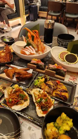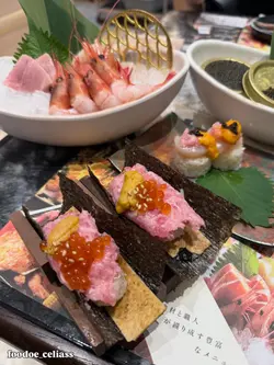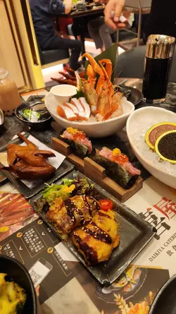 聚舊日Part 2,夜晚去食放題,揀了殿大喜屋,之前食過尖沙咀果間都幾正,今次去帝京果間,優惠時段比人霸晒,自選時段都照殺,Book左3位。 20:15-10:15,自選時段任食兩小時。餐廳面積頗大,樓底高有空間,3人坐的位子十分闊落舒適。自助區,落左單之後即輪流出去睇下有咩食,飲品有好多選擇,梅酒、清酒及紅酒都有(但都係偏淡味),有湯水及糖水果下正。冷盤、熱盤小食種類都多,甜品亦唔少,連靚靚馬卡龍都有,雪糕都有好多款同軟雪糕都有。放題第一盤刺身擺盤一定係最靚,即打卡,刺身多款,要了甜蝦、帶子、金槍魚腩、油甘魚、三文魚及松葉蟹腳,新鮮肥美,當中喜歡三文魚及甜蝦。鱘魚籽醬,預到係咩料但都想試下,鹹鹹地唔太有鮮味,好奇一試。海膽拖羅鱈魚干手卷,賣相吸引,有吞拿魚蓉、海膽及魚籽,餡料十足,味道鹹鮮口感豐富,美味。花菇紅燒鮑魚,賣相吸引,有埋西蘭花作配菜,鮑魚口感彈牙,配合個汁味道濃郁,花菇軟腍。花雕醉鮑魚,食落有少許酒味,但味道較淡,口感較韌。金湯燴花膠,必食,感覺名貴,3人份擺晒係一碗到變左感覺好多,花膠大件厚身,口感爽口彈牙黏稠,少許鮮味,食一件都好飽肚。鮑魚皇帝蟹黃粥,個色水賣相不俗但唔見有蟹蓋(因見隔離枱有),粥底幾綿味道鮮甜。 皇牌燒乳鴿王,賣相都幾靚仔,皮脆肉嫩又香口。川燒珍寶鮮蠔燒,燒蠔肥美飽滿,口感鮮美又多汁,加上大量的蒜好惹味。 泰式金不煥炒蜆,蜆肉飽滿,香口惹味。油鹽焗奄仔蟹,蟹膏甘香,蟹肉鮮甜,不俗。 酥炸桶蠔,個炸皮大厚蠔太細,食落太油味道一般。殿堂級鐵板鵝肝厚多士,厚身大件,味道甘香油潤,多士香脆。蟲草花烏雞湯,飲下湯水,都幾油。自助區小食。甜品都幾多可愛造型,好多人推介花花馬卡龍,打卡之選,試了玫瑰味,口感酥脆帶少許煙韌,淡淡的玫瑰香味,唔太甜,睇得又食得。柿的糯米糍,外皮軟糯,入餡全是cream太甜。 倉鼠造型的芒果布甸,好可愛。狂食雪糕,Häagen-Dazs冧酒提子、焦糖脆餅及牛奶焦糖和肉桂油條,冧酒提子好味就梗,後者兩款都幾好味,係甜左點。Mövenpick檸檬青檸雪葩,酸酸地清香味道。 食物味道不俗,坐得舒適,服務正常,上菜都算快,愉快的一餐。…查看更多