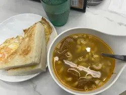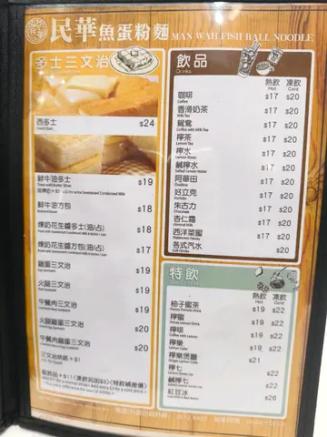 晨早出门去睇波,第一时间梗系叹个醒神早餐🍴先啦!大埔墟公园仔一带餐厅林立,点指兵兵入咗广福里呢间"民华鱼蛋粉面"。地方细细,眼见12张枱仔,姐姐有礼貌,唔该前唔该后👍赶时间,咋咋临叫咗个先姜丝牛肉通配餐肉炒蛋多士🥪,再加多杯冻咖啡($45)牛肉嫩滑,汤底够味,多士香脆唔会㶶,炒蛋嫩滑,唔错唔错👍冻咖啡先系灵魂,饮完即刻好精神🤣🤣睇下个餐牌,哗!食物品种都好多选择,有汤饭、点心、蒸饭...快闪一个丰富好味嘅早餐,够晒energy,出发💪