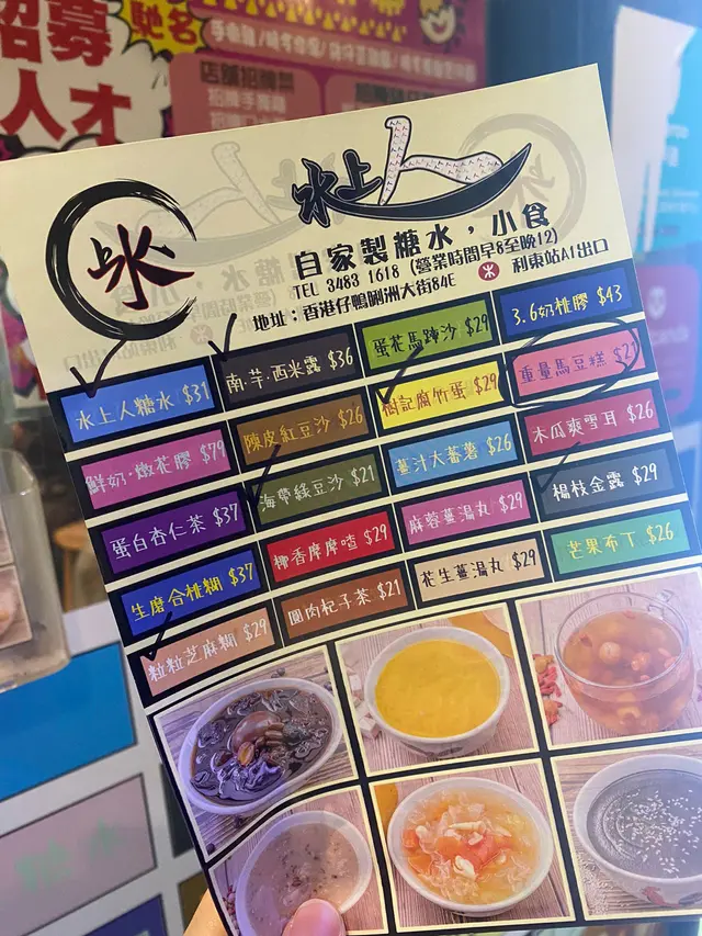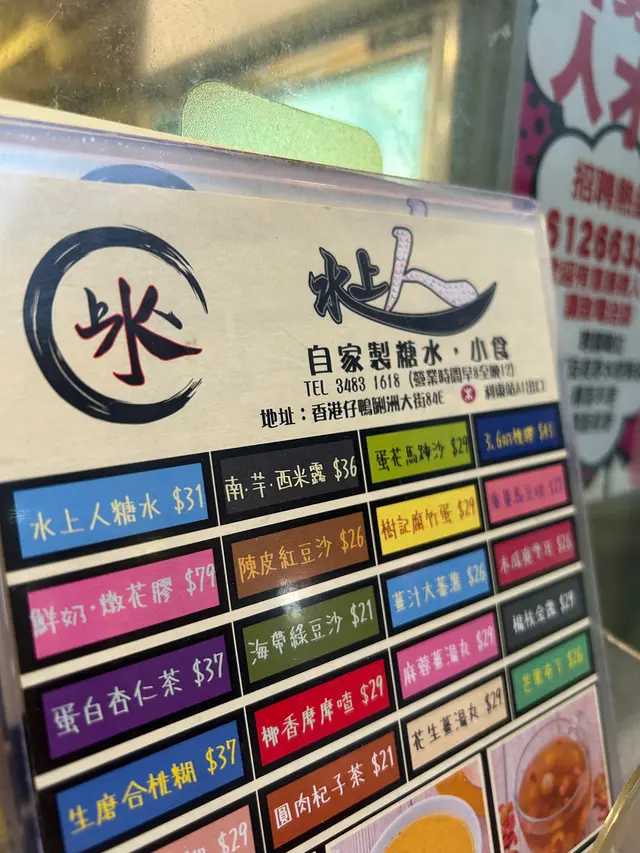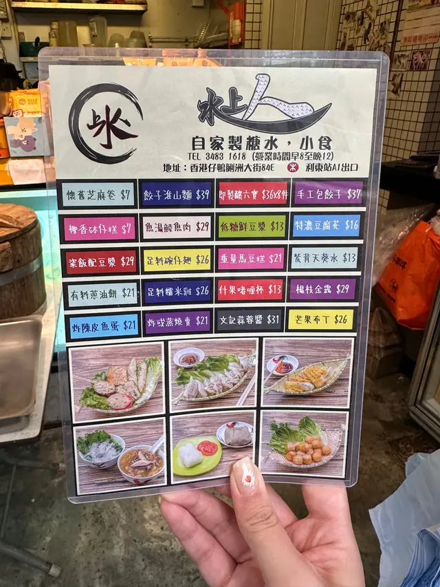 - 難得放假,就去左朋友屋企玩,不嬲都有聽講鴨脷洲係港島南區著名既避風港。- 但講到美食,就真係全靠朋友推介。朋友話今次呢間糖水鋪係老字號,佢同屋企人都食左好幾年。- 呢度糖水以外賣為主,等待既時候都不乏熟客仔幫襯。而且店鋪除左糖水,仲有好多熟食同零食售賣,包羅萬有!- 睇到Menu果時,我比較好奇水上人糖水係咩?所以都同朋友叫左黎試,另外仲叫左鮮奶燉花膠、生磨合桃糊配花生湯圓、椰香摩摩喳配芝麻湯圓同麻蓉薑湯圓。- 先講水上人糖水,呢款對我黎講真係好新奇,因為坊間係無得食嫁!呢款糖水係由生熟地、玉竹頭、鳥豆、雲耳同雞蛋煲既,據說有烏髮養顏、瘦身補血同促進腸臟蠕動既功效。而且全部藥材都煲稔哂,全部都食得!雖然話佢係由藥材煲成,但食既時候真係好易入口,完全唔覺係中藥🌿。- 而鮮奶燉花膠就唔洗講都知養顏啦,相反呢碗糖水花膠唔會煲爛哂,加上鮮奶係滑上加滑。- 至於生磨合桃糊配花生湯圓,簡直深得我心!因為味道濃厚得黎唔會太膩,果仁類係我至愛💖!我今次仲忍唔住加埋花生湯圓,食落暖笠笠同煙煙韌韌,大滿足!- 椰香摩摩喳係朋友叫既,朋友話呢款口感非常豐富,有唔同豆類同芋頭,再加上椰汁,飽肚又滋味。- 最後,麻蓉薑湯圓係有暖胃、散寒治血同舒筋止痛既功效。呢款真係薑味十足,夠哂辣,非常適合冬天食!查看更多