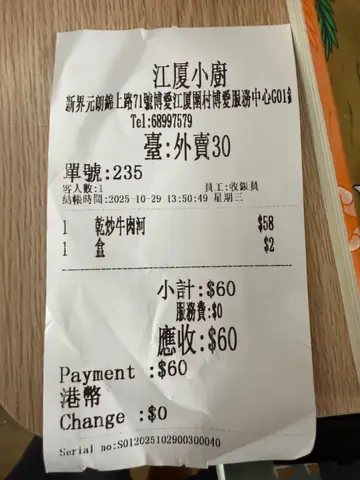 刚好要去探望朋友, 来到了元朗八乡的江夏小厨。餐厅地方宽躺,位置多,楼底高,没有压迫感。点了三个菜式: 芥兰炒腊味,沙嗲肥牛粉丝煲,炸蚝饼先来说说芥兰炒腊味,芥兰新鲜爽脆,不会过熟或太生,炒得火喉刚好,润肠香而不腻,如果腊肠再瘦些,就更好了。沙嗲肥牛粉丝煲,老实说很多地方吃这道菜,粉丝都煮得太过,整煲容易稠杰。但这个没有啊!刚刚好,而且热力十足,很好吃!最喜欢就是炸蚝饼了。蚝仔份量足够,不会只吃到炸粉浆,而且粉浆调得刚好!…查看更多