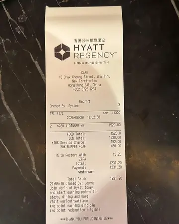 OpenRice的积分即将到期, 见很久没光顾酒店的自助餐, 便找一间可用OpenRice Rice$的酒店豪吃一番。沙田凯悦酒店咖啡厅是是次的选择, 经官方网站订座, 某些日子有机会享高达5折优惠, 可惜OpenRice积分到期前的日子已没有5折优惠, 经OpenRice订座, 可享7折优惠。1) Lunch Buffet $4602) 经OpenRice订座享7折优惠3) all + 10% (以原价计算)4) $367以OpenRice Rice$支付咖啡厅环境宽敞, 有落地玻璃采自然光, 十分舒适。当日光顾, 目测满座, 食客均斯文有礼有秩序, 不会争先恐后, 用餐体验实属不俗。走了一圈, 见食物款式不少, 卖相吸引, 增添不少食欲。也许太久没吃自助餐, 节奏有点慢, 亦忘记了食物再补充时未必是同款, 故想吃的, 尤其是甜品, 有部份便吃不到, 造成失望。自助午餐包餐饮一杯, 而自助区可任饮的饮品款式不多, 只提供香橙冰茶和咖啡, 唯香橙冰茶果汁味道略淡。鱼生偏瘦, 油脂不多。虾有虾籽。希灵鱼爽口, 是当中较佳的选择。本身对需要去壳的海鲜有点抗拒, 故只象征式取了蟹钳, 熟虾和蚬, 蟹脚一只也没取。餐厅虽有提供工具, 蟹钳仍难以去壳, 但鲜味。熟虾肉质较实, 还是蚬肉美味。吞拿鱼汁薄切猪柳片肉质偏干, 八爪鱼薯仔沙律和蕃茄沙律清新爽口。炸面团香口, 如吃港式油炸鬼般香脆。试了3款芝士, 水牛芝士味道比想像中淡, 其余两款芝士味道较浓, 瑞士芝士质感较硬, 布利芝士质感较软绵。另浅尝了巴马火腿配哈密瓜, 薏米沙律和cold cut, 质素不俗。咸蛋黄炒虾虾肉爽口, 咸蛋黄味道明显。烤西冷由于冷得快, 边位的油脂份外碍眼, 肉质偏干柴。Pizza蕃茄味明显, 饼底松软, 如属薄脆形饼底, 口感更佳。炒白蚬壳多肉少, 火腿干咸。焗鳕鱼肉质干身偏柴, 配上酱汁, 仍然美味。意大利黑松露云吞芝士馅较实净, 本身已很creamy, 但自行洒了芝士粉, 变得有点腻。烩牛面肉大大件, 味浓, 有嚼劲。烧菠萝多汁, 有助解腻。烧羊架粉嫩, 口感味道均不错。咖喱猪皮鱼蛋咖喱味道虽明显, 但却被辣味喧宾夺主。鱿鱼爽口, 鱼蛋虽爽但不弹牙。烧卖大粒, 卖相可以。虾仁炒甜豆, 虾仁爽口, 甜豆爽脆。虾片脆口, 姜汁炒芥兰青绿爽口。酸菜蒸龙脷柳很滑, 无骨。叉烧炒饭饭粒粒分明, 唯叉烧粒不多。云吞一口大小, 皮不滑。蓝莓芝士蛋糕味道浓郁, 质感软滑。荔枝玫瑰乳酪蛋糕卖相吸引, 红色的球加上唧花和荔枝, 简单就是美。入口顺滑, 轻巧清爽, 毫无负担。朱古力慕丝蛋糕柔滑, 朱古力味浓, 蛋糕底软绵。芒果乳酪慕丝蛋糕芒果味淡淡, 顺滑, 饼干底添口感。面包布丁香滑, 配上蜜瓜, 西瓜, 青提子, 红提子和菠萝, juicy之余又有助减饱滞感。雪糕并无标示品牌, 一问之下原来当日供应的是Häagen-Dazs的出品。先来3球雪糕, 云呢拿, 焦糖脆饼和夏威夷果仁, 3款均重奶香, 各有特式, 吃毕忍不住再添了3球, 云呢拿, 焦糖脆饼和咖啡味, 感觉满足。总括来说, 食物款式不少, 只拣选了部份来吃。甜品十分出色, 建议入场后看见想吃的先取, 否则回头可能吃不到, 因未必会refill同款甜品。沙律清新爽口, 鱼生, 海鲜和热食只属中规中距。不过以款式和餐厅环境, 如能以5折价格来享用, 实在吸引。…查看更多