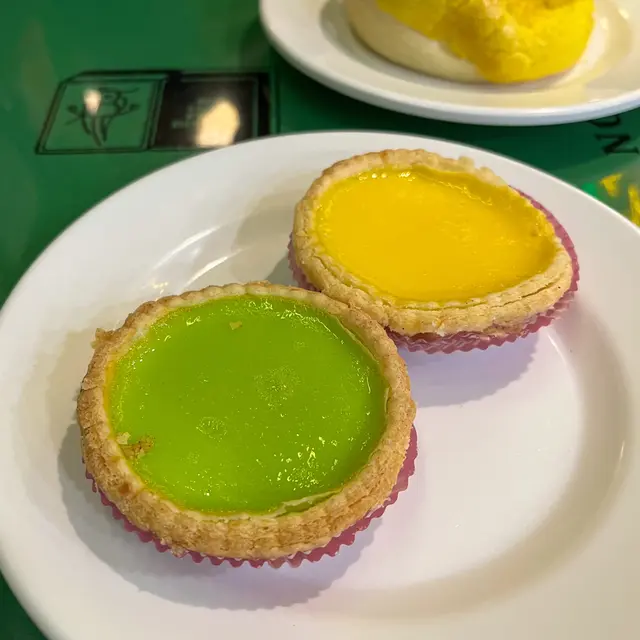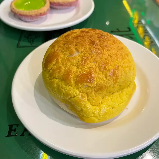 Pandan egg tart and Pineapple bunA local cha chan teng in Shatin (Shek Mun), bakery are fresh out from the oven every 15-20 minutes. Just adjacent to the storefront is their in-house bakery and you can get the takeaway order right away. Lucky to have the very last batch egg tart of the day at around 3:30pm. The green coloured egg tart catch my eyes and is definitely very photogenic, it is actually a pandan flavour egg tart in shortcrust cookie base and costs $11 per each. Their green treats are sweet with a buttery, crumbly exterior. However it does not have the wow factor in taste. The pandan and egg flavour is subtle and more on the sweet side.The pineapple bun is big in size, crispy and hot when served. It’s a crunch and crumbly delight with a golden yellow crust set over a soft and fluffy bite. Love it!查看更多