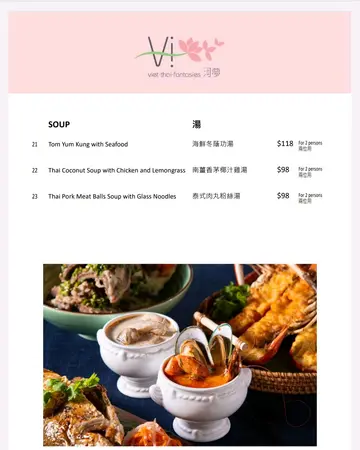Vi 乃越南语,即「味道」之意,意谓为食客带来无穷味道。餐厅供应越南及泰国菜,烹调手法会在传统中混入西式概念。
