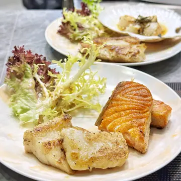 千估万估都估唔到屯门居然有铁板烧,身为屯门人有咩理由唔黎试下!🇯🇵鲷鱼二人套餐 (星期一至五 $888 免加一)🍴先付超新鲜沙律!啲菜好爽脆,配上面头的鱼籽好新鲜,成个搭配清新得黎又开胃~🥗🍴鲜鱿鱼鲜鱿鱼配上烤蒜上碟,人均份量都几多下~肉质爽口弹牙!每一口都散发出海鲜的鲜甜味呢🦑💦🍴鲷鱼柳嫩滑鲷鱼柳配上适度调味,锁住左本身鲷鱼的原汁原味(超鲜甜!),而且肉质弹牙,一啲都唔腥!烧嘅后段师傅仲加左啲牛油落去,超香口~🍴美国安格斯西冷师傅先烧晒脂肪个面嘅油出黎,再用个啲油去煎比较瘦嘅部份,有好好将肉汁锁住之余而外层亦恰到好处,仲做到入口即溶嘅感觉~师傅好高招!拌碟仲有番薯仔同蒜片,两样同牛一齐食都好正🥩🍴黄金炒饭粒粒分明嘅珍珠米,形态超靓呢!蛋香好浓~好特别嘅系师傅加入左啲酸菜入去,令到成个炒饭有重中日合壁嘅感觉之余,亦无违和感呢🍴季节什菜有芽菜、椰菜、红萝卜、葱等等,食完炒饭再食菜可以解下腻,先再继续食甜品🙌🍴面豉汤都算几多料呢~汤底浓郁,鲜味十足,配上蔬菜,口感浓厚而滋味丰富🍲🍴甜品甜品系椰汁糕!香甜而口感软绵, 椰香味超浓!食落去慢慢咁溶化系口入面,好幸福的感觉呢~( ´▽`)