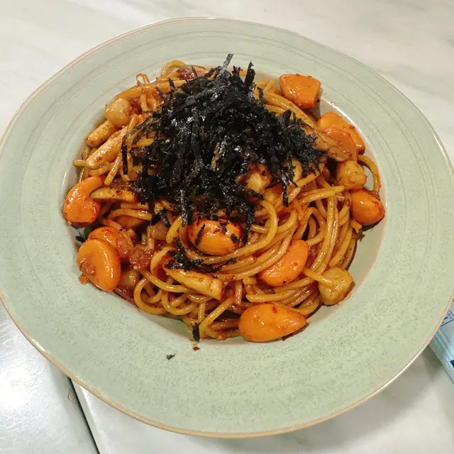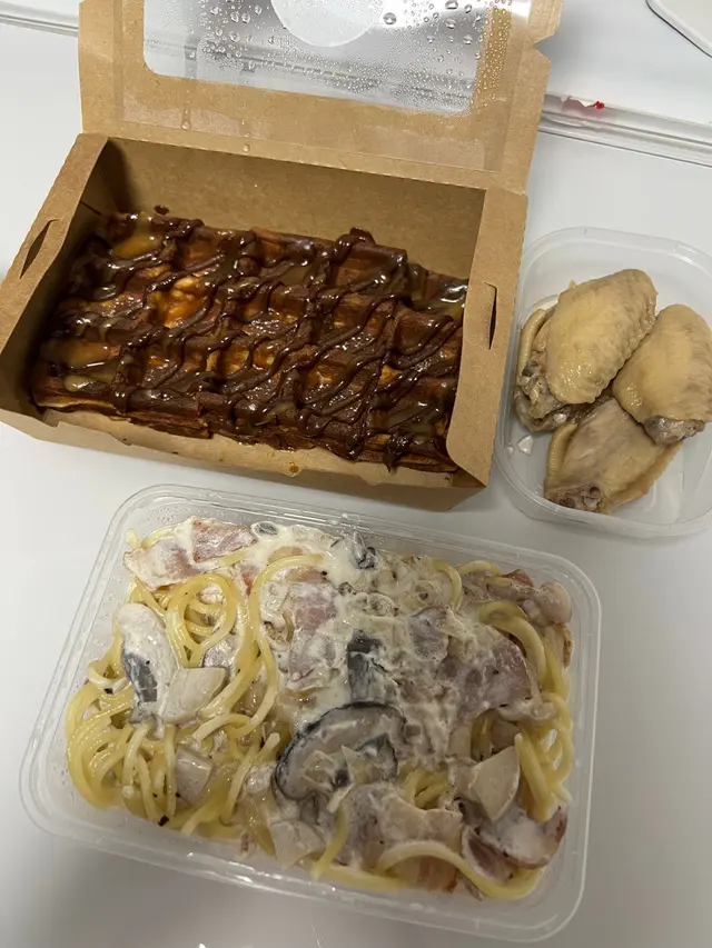 芝士鮮茄肉醬長尖通粉、明太子蟹肉意粉、凍鮮奶抹茶、泡沫咖啡、士多啤梨窩夫