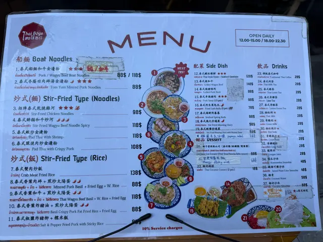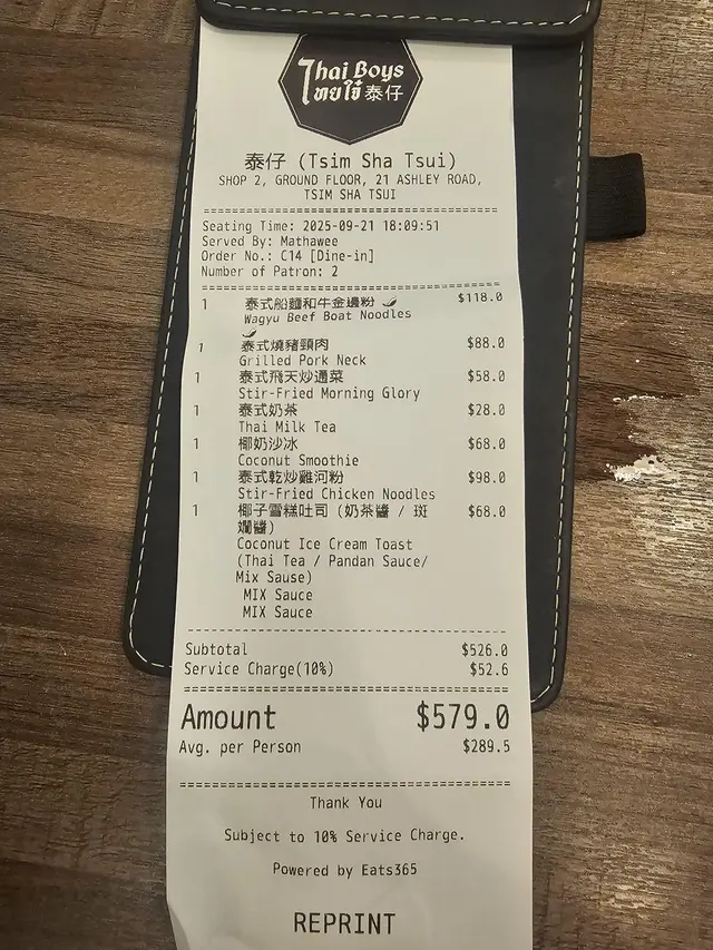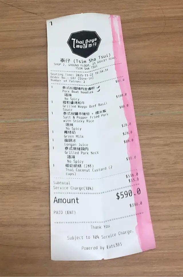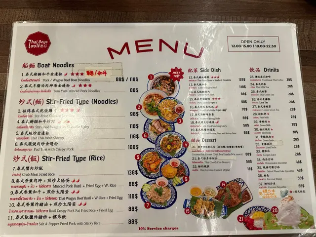 # 🇹🇭 【食評】尖沙咀《泰仔 Thai Boys》——天花板級泰菜滋味🔥 今日同老婆行到尖沙咀Ashley Road,心血來潮諗試新開嘅呢間泰菜店《泰仔 Thai Boys》。一入門口已經俾嗰股濃厚泰式氣氛吸引—— 店內裝修好新淨,牆身有啲色彩繽紛又地道feel嘅泰國poster,少少hipster味但唔浮誇,環境整體光亮乾淨。 最加分嘅係店員全部都係泰國人,講英文加啲泰式口音英文,好親切,感覺真係有少少坐喺曼谷街邊食檔咁既錯覺。 ---## 🥢 主菜篇 ### 🐄 和牛炒河($118)講真,呢碟和牛炒河係成餐嘅靈魂。 一上枱嗰下已經聞到陣陣鑊氣撲鼻,炒河用嘅醬汁鹹香帶少少辣味,個味層次好豐富。河粉啜晒汁又唔爛,炒得夠乾爽; 重點係個「和牛」👍🏼——肉嫩得嚟仲好juicy,啲油香滲晒入去啲河粉入面,啖啖滿足。 真係想講一句:**泰式炒河嘅天花板!** ---### 🦀 蟹肉炒飯($138) 飯炒得金黃,每粒飯都分明乾爽,冇油笠笠嗰種感覺。 蟹肉份量勁多,唔係得啲碎屑,而係真‧蟹肉啖啖肉; 配上佢隨碟附送嘅青檸同魚露辣椒汁,一啖蟹肉一啖飯,加埋少少青瓜片,香口得嚟又夠清新——食極都唔膩。 ---### 🐷 燒豬頸肉($68) 呢個都係驚喜之一!切得厚身啱啱好,每件都有靚油脂層,燒到外脆內嫩。 沾埋佢嗰個泰式酸辣汁,一齊食真係好惹味。 份量唔少,兩個人share啱啱好。 ---### 🦪 蠔餅($128) 一上枱個賣相就好吸引——煎蛋金黃色,表面啲蠔粒同魷魚又多又大粒! 個蛋煎到外脆內滑,帶微微焦香;配埋海鮮,真心勁正。 淋啲甜辣汁落去,酸甜平衡一流,好似瞬間穿越到曼谷夜市咁。 ---## 🥥 飲品篇 ### 椰汁沙冰($88) 呢杯真係超浮誇🤣 一大個椰青入面堆滿晒白雪雪嘅沙冰,賣相100分。 飲落超滑、清甜得嚟唔死甜,仲食到啲椰肉碎。兩個人share都飲唔晒,打卡又好味。 ---## 💬 總結感想 《泰仔 Thai Boys》呢間尖沙咀泰菜店真係有驚喜。 **食物水準高**:鑊氣十足、味道真材實料; **環境舒服**:新淨又有泰國風情; **服務態度好**:店員有禮又細心; **價錢中等偏實惠**:四道菜加飲品埋單$594(連加一),以尖沙咀嚟講非常合理。 ---### 🌟 推介指數:⭐⭐⭐⭐⭐(5星滿分) **必食推介**:和牛炒河+蟹肉炒飯+椰汁沙冰 **一句總結**: > 真材實料嘅泰式風味,唔洗飛曼谷都食到地道滋味!🔥 📍 **地址**:尖沙咀亞士厘道21號地下2號舖 ⏰ **營業時間**:12:00–15:00、18:00–22:30 🥣 下次會再黎試佢嘅泰式船麵!…查看更多