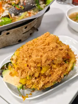 就在金鱼街的一间泰国菜餐厅,不要看他店小小的,其实有两层的,晚上人气不错,还有超划算的优惠,味道又不错,难怪吸引到不少人。泰式海蜇(1元)消费满300元就可以1元换购,还有4款可选,超高性价比!1元的份量也很足,味道酸辣带点甜,海蜇鲜嫩弹牙。泰式孖宝B(238元)性价比不错的套餐,出面有些餐厅单点一条乌头都差不多要200元了,这里还配了有炒饭!而且鸟头的尺寸也不少,肉质嫩滑,吸饱酸酸辣辣的汤汁,特别惹味,配菜也很多。菠萝海鲜炒饭料也很足,加了青口,虾仁,鱿鱼,再配上大量的配料一起炒香,当然少不了香甜的菠萝了,整体酸酸甜甜的,又有蛋香,海鲜味足。泰式咖哩海虾(114元)很有惊喜,满满的海虾,口感爽滑弹牙,而且开背了,虾肉包裹了满满的咖哩汁,特别惹味。咖哩的味道香浓,带甜味,亦有很浓的蛋香,非常下饭或配薄饼。薄饼(42元)薄饼吃起来感觉不是平常的预制菜,口感特别酥脆,味道挺香的。泰式香茅鸡翼(19元)烧猪串(18元)烧鸡串(18元)串烧卖相不错,上面加了大量的沙嗲汁,味道特别香浓,带点微辣,非常惹味!鸡翼烧得焦香有肉汁。猪肉用的是梅头肉,较嫩滑。鸡串是鸡腿肉,有弹性又多汁。椰青(44元)大大个椰青,味道清甜,喝完最后再吃椰肉就最好了。…Read More