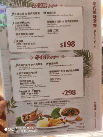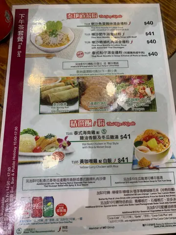 经过旺角又想食泰国嘢就嚟试试呢间连锁店啦下午茶都会免费送一罐汽水面粉类仲会送一份小食添,都好似几抵叫咗一个海南鸡饭同埋泰式船仔汤金边粉,小食就要咗扎肉沙律先讲个海南鸡饭,只鸡比较肥,鸡皮好厚,个人比较喜欢薄皮小小嘅鸡。至于个饭就有点儿湿,但系个鸡酱都好食嘅,至于个冬瓜鸡汤虽然见唔到汤料,但都几好味泰式船仔金边粉可以拣猪肉或者牛肉,我就拣咗牛肉不过就好un,但系两粒丸仔都几好食,但个汤底就淡左少少,如果在浓返啲就好食扎肉沙律唔系好够酸,旧扎肉又冇乜味,不过都切得几厚嘅