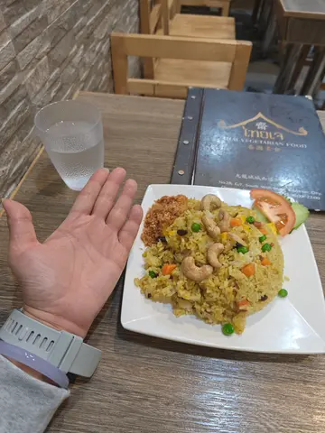 今日也想食素, 今日去九龙城, 也search下有乜嘢素食店, 见到泰国素食, 之前未试过, 之后就坐车落去, 再去找找😚, 去到可能时间尚早, 只有一枱客人, 之后比安排坐二人枱, 店员倒左一杯🥤水给我, 我望下餐牌, 查实都几多选择, 但一个人食唔到d乜嘢, 又唔想食辣🌶️, 就叫左个菠萝🍍炒饭, 等左一阵, 炒饭送上😅, 卖相都几靓仔😍, 金黄色侧边有d素肉松🤩, 面有d腰果, 之后将素肉松同腰果捞埋入饭一起吃, 食落唔油, d饭一粒粒🤗, 又几好味😛, 入面有d提子干, 青豆粒, 红萝卜粒🥕, 另外有d素肉粒, 真系越食越觉得唔错😁, d菠萝🍍粒又够酸, 食落几开胃, 食野期间都见越来越多人🤭🤭有下次有下次, 下次又试下其他🥰😘…查看更多