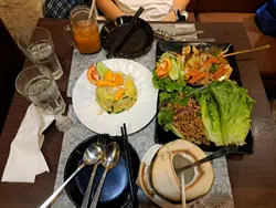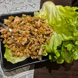 今日放工,心情有啲唔错,于是决定同朋友去旺角食泰国菜。朋友推介咗一间餐厅,听讲环境唔错,座位都几舒适,最重要系餐牌选择多元化,真系好吸引。。一入到餐厅,装潢以木系和植物为主,感觉好自然、清新,令人有种置身热带雨林嘅感觉,整体氛围好轻松,真系好适合同朋友聚餐。。餐牌上有好多选择,从经典嘅泰式咖喱到新颖嘅创意菜式都有。最后我哋决定试下几样嘢,首先就系肉碎生菜包。呢个菜式基本系我既泰菜必点之选,生菜包住肉碎,口感清新,味道一流,每一口都食到满满嘅泰国风味。。跟住就系泰式青柠蒸原只鱿鱼,呢道菜一上嚟就已经吸引到我哋嘅眼球,鱿鱼煮得刚刚好,肉质鲜嫩,配上青柠嘅酸味,真系好开胃!我觉得蒸嘅方法令鱿鱼保持咗原汁原味,完全冇𠮶种腥味,反而系清新嘅海鲜味,真系好正。。最后,我哋试咗泰式蛋包金边粉伴虾。呢道菜就更加吸引,蛋包包住金边粉,特别酱汁配上花生粒,里面仲有大大只既鲜虾,味道丰富。每一口都可以食到虾嘅鲜甜,加上蛋嘅滑嫩,真系好享受。。食完嘢之后,心情更加好,真系一个唔错嘅选择!餐厅真系值得一试,价钱应该算中低档,但座位舒服,食物高质,下次会再同屋企人再试其他菜式。查看更多