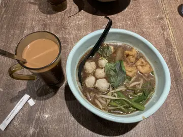 今次叫左泰式肉丸汤河,饮奶茶,加配春卷。成个汤面望落好足料呀,有豆卜、萝卜、通菜、大豆芽。主菜肉丸细细粒,口感都算弹牙。个汤虽然唔辣,但好浓味,食完会好口渴,想饮好多水。所以平时会饮埋个汤既我都唔饮了。河粉厚厚短短唔太滑,个人就唔太钟意呢个口感啦。份量都多,食完就觉得好饱。加配既春卷值得一赞,佢应该系即叫即炸,影完靓相放左一阵先食仲好热辣辣,脆卜卜,好好味。热奶茶,茶底好重,然后果晚我眼光光训唔好,好彩第二日唔洗返工。星期六系要加一服务费架。时间关系,餐厅唔多人,都几岩倾计架。