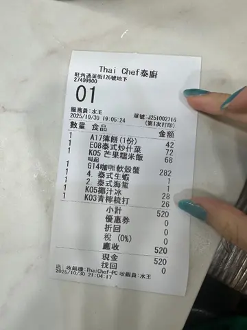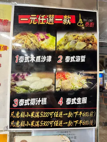 就在金鱼街的一间泰国菜餐厅,不要看他店小小的,其实有两层的,晚上人气不错,还有超划算的优惠,味道又不错,难怪吸引到不少人。泰式海蜇(1元)消费满300元就可以1元换购,还有4款可选,超高性价比!1元的份量也很足,味道酸辣带点甜,海蜇鲜嫩弹牙。泰式孖宝B(238元)性价比不错的套餐,出面有些餐厅单点一条乌头都差不多要200元了,这里还配了有炒饭!而且鸟头的尺寸也不少,肉质嫩滑,吸饱酸酸辣辣的汤汁,特别惹味,配菜也很多。菠萝海鲜炒饭料也很足,加了青口,虾仁,鱿鱼,再配上大量的配料一起炒香,当然少不了香甜的菠萝了,整体酸酸甜甜的,又有蛋香,海鲜味足。泰式咖哩海虾(114元)很有惊喜,满满的海虾,口感爽滑弹牙,而且开背了,虾肉包裹了满满的咖哩汁,特别惹味。咖哩的味道香浓,带甜味,亦有很浓的蛋香,非常下饭或配薄饼。薄饼(42元)薄饼吃起来感觉不是平常的预制菜,口感特别酥脆,味道挺香的。泰式香茅鸡翼(19元)烧猪串(18元)烧鸡串(18元)串烧卖相不错,上面加了大量的沙嗲汁,味道特别香浓,带点微辣,非常惹味!鸡翼烧得焦香有肉汁。猪肉用的是梅头肉,较嫩滑。鸡串是鸡腿肉,有弹性又多汁。椰青(44元)大大个椰青,味道清甜,喝完最后再吃椰肉就最好了。…Read More
