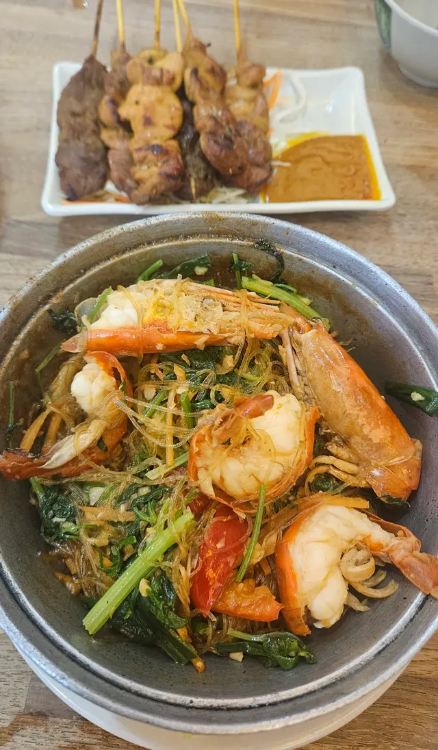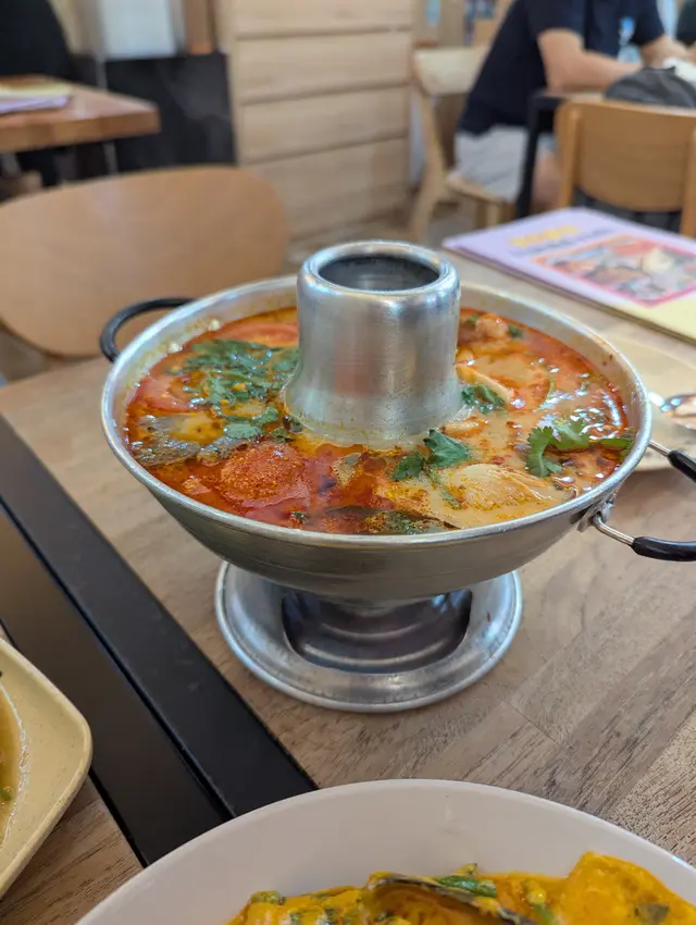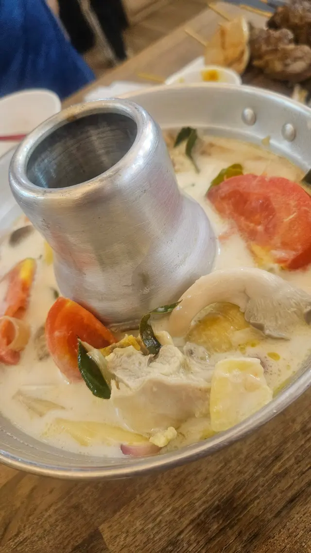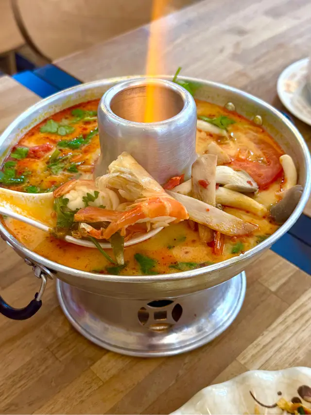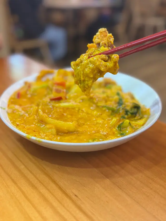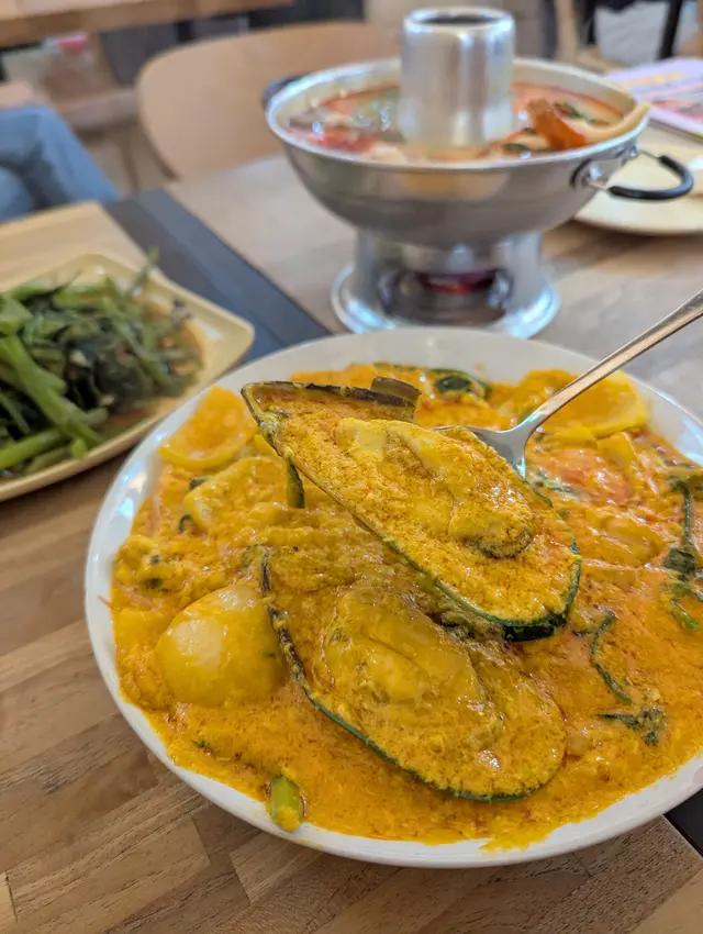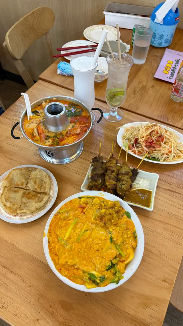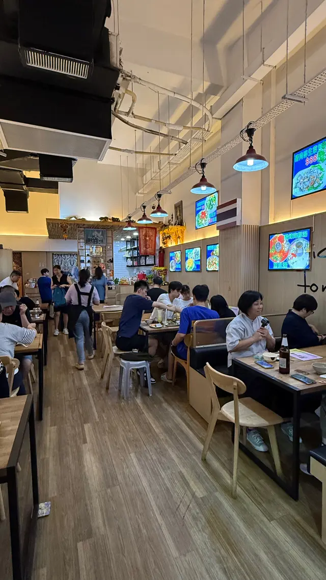唔講唔知,舊舖因為市區重建,靜雞雞搬咗去福佬村道三個月~新舖真係光猛乾淨,感覺超chill。一入去就聽到老闆娘把聲,即刻有種返回老家吃飯嘅感覺。📌青檸梳打酸甜解渴又冰涼📌椰汁沙冰椰汁濃郁,夠晒清爽又解辣📌咖喱炒軟殼蟹軟殼蟹外脆內嫩,肉質鮮嫩多汁,咖喱汁辣度剛好溫潤不嗆,配上洋蔥同紅椒嘅脆爽,幸福感滿分📌薄餅香而不膩,蘸咖喱汁一齊食係永恒配搭📌泰式木瓜絲沙律木瓜絲細長清脆,淋上酸甜辣醬汁,夾著花生碎同乾辣椒嘅脆響,層次分明📌串燒沙嗲有豬牛雞三款,燒得外焦裡嫩,醬汁甜鹹平衡,全部juicy惹味📌冬蔭功湯底夠香濃,酸香撲鼻,大蝦彈牙鮮甜,菇類同香茅嘅清新香味層層疊加,熱辣辣飲一啖,解膩開胃📌芒果黑白糯米飯糯米飯Q彈,芒果清甜,配上椰漿甜度剛剛好,完美ending!味道依然咁正宗,價錢仲係咁公道,又唔收加一~睇嚟以後要繼續同街坊爭枱啦!…查看更多