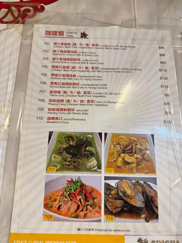在这份美食盛宴中,飞天通菜、黄咖哩鸡配蒜蒸蓉包以及冬荫公汤煮活鱼,每一道菜都带来了独特的风味和文化背景,为我们的味蕾奉上了一场精彩的飨宴。飞天通菜以其翠绿的色泽和爽脆的口感而受到喜爱。这道菜常常在亚洲餐桌上出现,通菜的清新、脆嫩可以有效地平衡其他重口味的食物。搭配大蒜炒香,简单却极致的味道,让人感受到自然的鲜美,无疑是一道保持健康的绝佳蔬菜选择。接下来是黄咖哩鸡配蒜蒸蓉包,这道菜肴结合了丰富的香料和出色的口感。咖哩的浓郁香气随著每一口的品尝而提升,鸡肉经过长时间的炖煮,变得十分嫩滑,不仅吸收了咖哩的精华,还散发出诱人的香气。蒜蒸蓉包则像是一个小小的惊喜,松软的包子里包裹著香蒜的味道,搭配咖哩一起享用,更是增加了整个餐点的丰富性。最后是冬荫公汤煮活鱼,这道泰国经典菜色完美展现了酸、辣、鲜的味道。汤底充满柠檬草、香茅和喇叭花的香气,让每一口都让人沉醉。活鱼的新鲜程度在汤中得以发挥,鱼肉鲜嫩而滑口,与汤的酸辣交织,让人食指大动。泰式食泰国菜馆 (九龙城)九龙城城南道11号地舖…查看更多