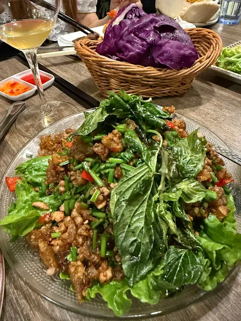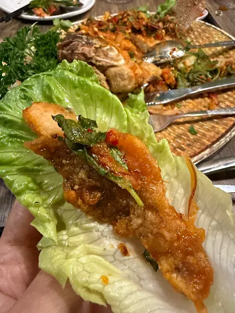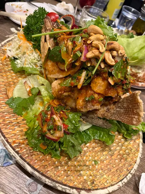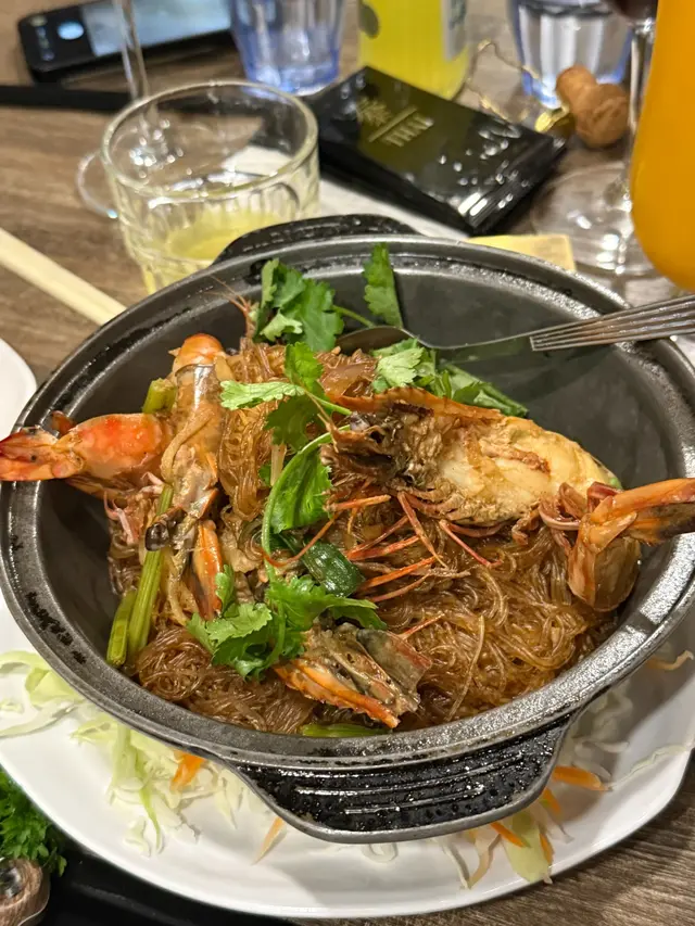 很喜歡佐敦泰泰各種獨特自創菜式,早前喬遷至附近新舖,即刻約朋友嚟食一餐先。先嚟生蝦刺身 $138 及 魷魚遊戲 $168 熱下身,堅持用新鮮蝦做嘅生蝦刺身零舍鮮味,坊間雪藏貨沒有蝦頭的喔,而店子就連蝦頭都炸香,實行一蝦兩食。魷魚遊戲即魷魚沙律,用咗3款不同嘅魷魚,鮮魷魚筒、水魷及秘製小土魷,配上秘製沙律汁,酸酸辣辣好醒胃。一行 8人,蝦多士 $138/4件 要2份先夠滋味,蝦膠彈牙,用米通代替麵包,炸得香脆不油膩,黑金黃金入球 $143 ,用新鮮墨魚滑包著鹹蛋黃蓉再炸至金黃色,切開後造型看似熟蛋,入口外脆內爽彈,加淡淡鹹蛋香,黑色版本是加了墨汁的墨魚滑包著黃金皮蛋黃,一樣好好味。主菜點咗青檸燒牛肉 $238,店子推介多一款星河燒牛肉 $238,比起青檸醬汁嘅酸辣,星河燒牛肉多一份胡椒香,配上豆角香葉用生菜包嚟食,又另一番感覺。粉絲蝦煲 $238 保持水準,最鐘意粉絲完全吸盡鮮蝦精華而且好乾身,食落依然爽滑。本來想食鴨肉生菜包,老闆介紹另一變奏版,小炒王生菜包 $138 ,加入韭菜粒及黃金皮蛋白粒更惹味,配上紫椰菜,又好夾呀。最後差點忘記的清邁酸辣羅非魚 $238,因為造型又名飛天魚,整條魚起骨切件炸起加泰式酸辣醬汁,友人見仲有生菜就包魚塊嚟食,多一點清爽。 店子飲品都做得好精緻洛神花沙冰,芒果沙冰及原個椰青沙冰都啱夏天飲,最後甜品芒果糯米飯滿足埋個甜品胃。…查看更多