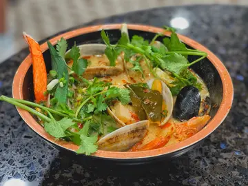 天气咁冻,又系打边炉嘅好日子!😎 但打得多都想食下啲其他食物,呢间餐厅就可以满足你唔同嘅愿望啦~😆 呢间泰式餐厅除咗有泰国食物,仲有泰式边炉!🍲😆餐厅门口有架tuktuk,好得意!😛 可以打下卡~ 卡位几好坐,又大又阔落,餐厅播住泰国歌,真系好似去咗泰国🇹🇭~😌1. 🐮冬阴功顶级安格斯牛肉薯粉🍜冬阴功汤酸辣味适中,好香椰香味,唔会好辣亦都够香浓,薯粉吸哂啲汤汁, 好入味,非常开胃!😋👍 顶级安格斯牛肉无咩肥肉,肉质都唔错~ 呢款汤底仲有好多配料,有青口、虾、蟹柳、猪皮、丸、杂菌等等,几足料!😎2. 招牌船汤浓汤锅🍲🫕用牛骨熬制,汤底熬至深褐色,非常浓郁,白萝卜好腍好清甜,完全无渣😋👍 煲完嘅配料完全唔使点酱汁,直接食已经好入味!😛火锅配料: 3. 日本3L广岛蚝 ($88)有5大只,全部都好新鲜又饱满,煮完都系胀卜卜,唔会太缩水的,食落鲜嫩creamy,推荐!😍👍4. 扇贝 ($88/4只)扇贝好大只,好新鲜!😍 煮都唔会缩水,好难得!鲜味十足!🤤5. 墨鱼丸 ($48)有5大粒,几弹牙,入面仲有啲墨鱼粒,几有咬口!👍P.S. 提提大家,餐厅会收酱油费$12/人🙊Read More
