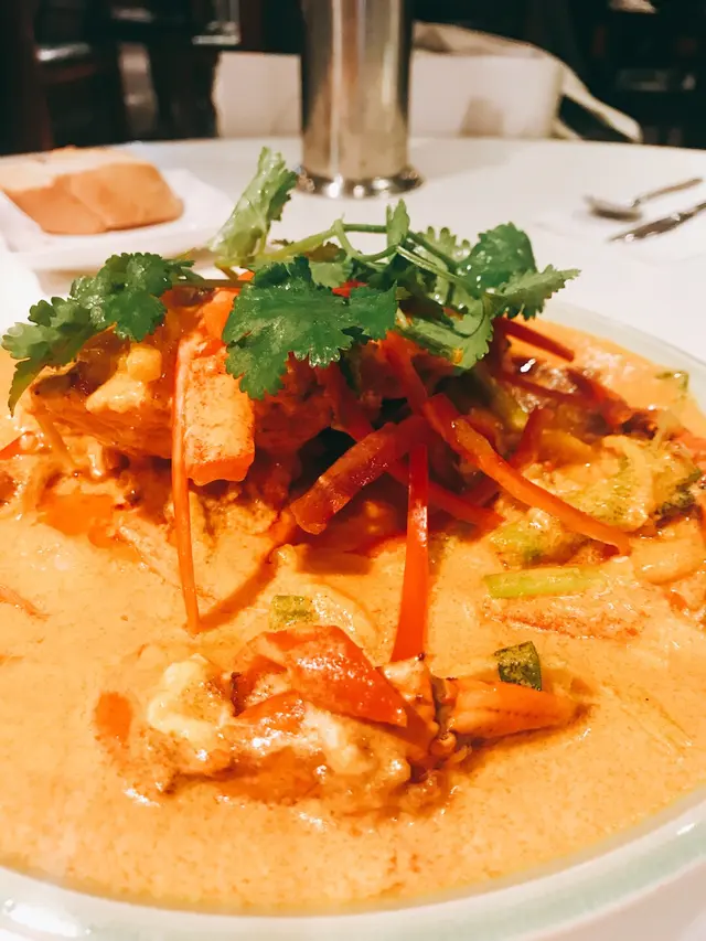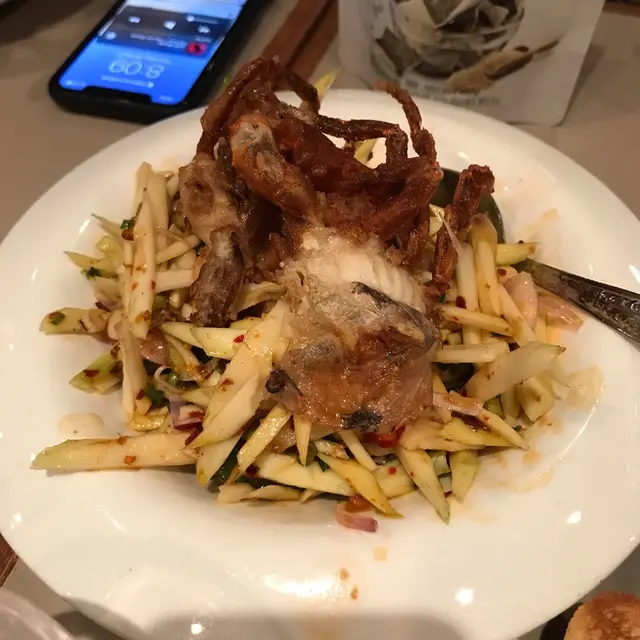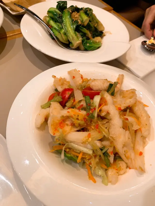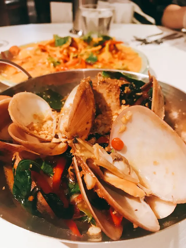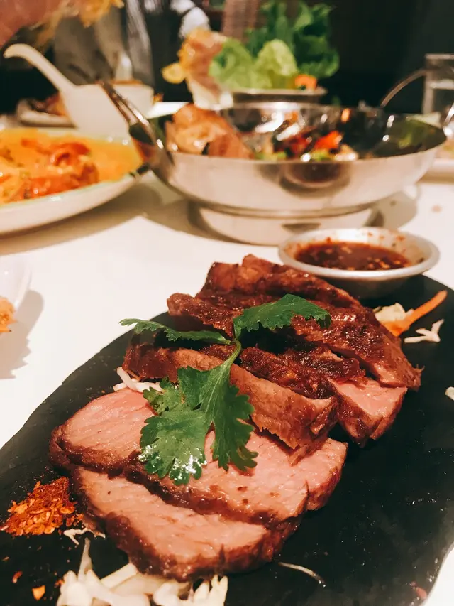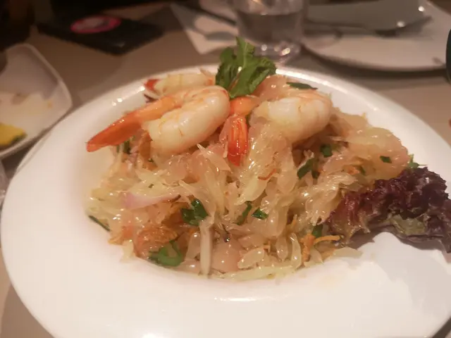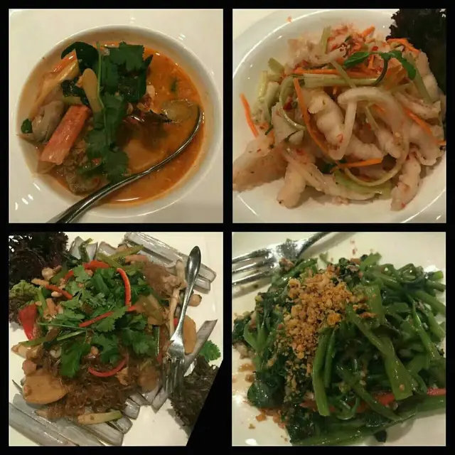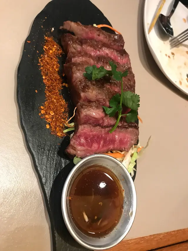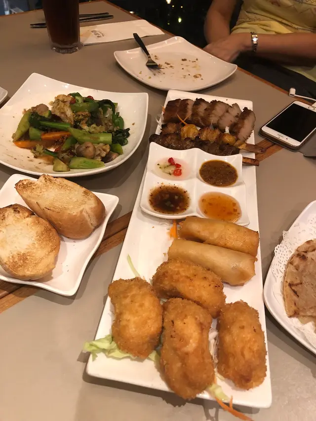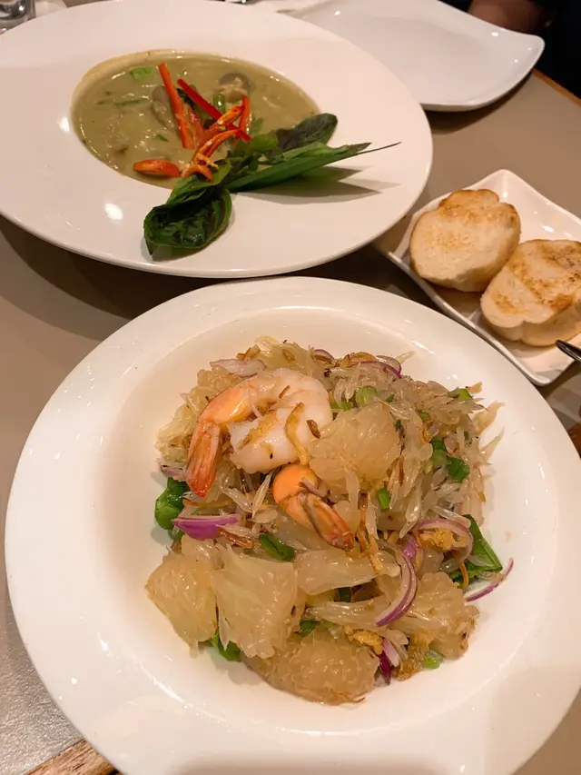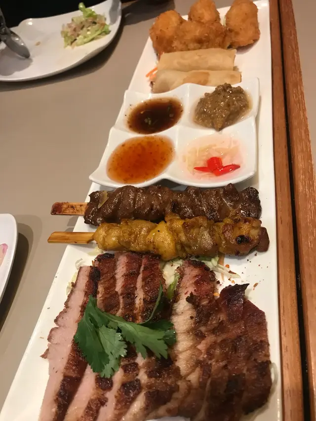 平日黎呢間泰菜,都好容易卜倒位,果日卜左6:00,上到去差唔多5:50餐廳仲未開,侍應叫我地等等係門口等等🙄入到去可能冷氣岩岩開,果陣up味都好西利下🙄講到食物,其實都幾好味,柚子沙律🥗酸酸甜甜好開胃;小食併盤,配有4款汁醬,豬頸肉就最出色,炭燒味好香,串燒同春卷,點下d沙嗲同甜酸醬😋好鬼正;燒牛肉order左6成熟,但黎到略生左小小,血淋淋咁🙄中間仲有好多根,牛味算重;馬拉盞炒通菜炒得好青綠,味道亦岩岩好。…查看更多