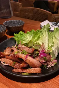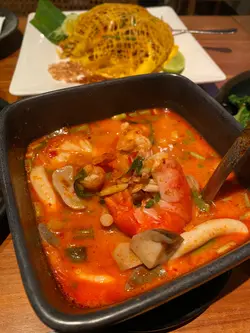 今日放工专登去铜锣湾跟旧同事聚吓旧,原来喺总统戏院上有间超好食嘅泰国菜餐厅,厨师全部都用泰国人非常地道,餐厅环境布置非常休闲,超级chill同朋友倾偈聚会非常一流。首先系个烧猪颈肉,一上枱已经闻到好香炭烧味!啲肉烧到外皮脆卜卜,带少少焦香,但入面啲肉汁锁到实一实,咬落去又嫩又弹牙,点埋个酸酸地嘅辣汁,完全唔腻,真系忍唔住食完一旧又一旧。跟住系个冬阴功汤,呢个真系考功夫!一饮落去,个汤底好浓郁,香茅同南姜嘅味好出,辣度同酸度平衡得啱啱好,饮完成个人暖笠笠。仲要有几只大头虾,虾肉爽甜又索晒啲汤汁,非常惹味。第三道系蒜片椰菜苗,估唔到可以咁好食!椰菜苗本身好嫩,冇渣,用大量蒜片同辣椒一齐炒,香气扑鼻。食落去爽脆得嚟带少少苦甘味,好有镬气,绝对系一道出色嘅青菜。泰式金边粉酸酸甜甜超开胃、最紧要系个金边粉入到米,同抄到非常有镬气。饮品方面,叫咗个原个椰青水,清甜到不得了!冰冻解渴,饮完成个椰青仲可以刮埋入面啲椰肉食,又滑又香,正到痺!最后整杯冻柚子茶作结,呢杯嘢真心惊喜!唔会死甜,饮到清新嘅柚子果肉,微微嘅甘香同茶底好夹,解腻一流。总括来讲,今餐饭每一样嘢都高水准,味道正宗,食到好满足。如果你钟意泰国菜,呢几款绝对值得试!…查看更多