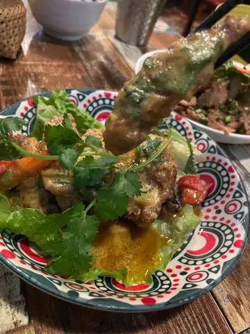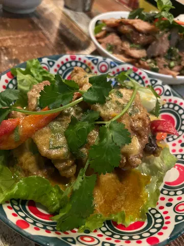 今次同朋友去咗西环呢间「泰夸张」食泰菜,一入门口就俾佢嘅花房装修吸引住!每张枱都放咗新鲜玫瑰花,角落仲有职员即场插花,成个环境浪漫到呢~我哋叫咗个四个嘢食两个饮品,人均$285食到劲满足!🌹 环境同服务▪️ 餐厅似温室花房,周围都系绿绿色为主题同鲜花▪️ 每张枱都有新鲜玫瑰,女生见到实心心眼▪️ 职员态度友善,会耐心介绍菜式▪️ 地点方便,香港大学站行几分钟就到🍗 咸蛋黄鸡翼 ($108)|邪恶之选鸡翼炸到金黄脆皮,面头沾满流沙级咸蛋黄酱,咬落去咸香爆棚!最正系个皮脆到似食紧蛋黄脆片,入面肉汁依然锁住,必点!🍚 芒果海鲜炒饭 ($128)|惊喜创意真系第一次见芒果炒饭!用咗新鲜吕宋芒果粒,甜到似食紧甜品~炒饭底够干身,有大只虾同甜甜猪肉干丝,咸甜交织好过瘾!🥗 海鲜泰式沙律 ($108)|清爽开胃超大碗!有齐大虾、青口、鱿鱼仲有。个汁调得啱啱好:酸中带辣仲有少少甜,辣度温和,唔食得辣都接受到~🍲 椰汁鸡汤 ($78)|温柔版冬阴功汤底系奶白色,椰香味好出!比起传统冬阴功,呢款更温和顺喉,好足料好多菇,选用咗鸡胸肉啖啖肉,饮完成个胃好舒服~🥤 饮品|泰式风情· 泰式奶茶 ($48):橙红色好抢眼,茶味浓得嚟唔涩,甜度适中· 泰式椰子奶 ($48):冰凉解渴,椰香天然唔假今餐真系由头惊喜到尾,尤其系芒果炒饭同花房环境,绝对会再encore!推荐俾想食特色泰菜同埋钟意打卡嘅朋友~…查看更多