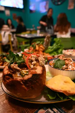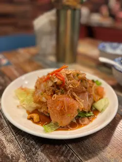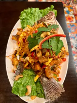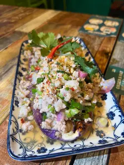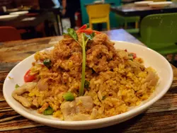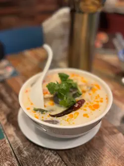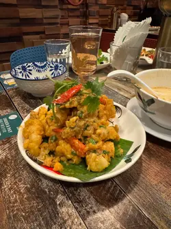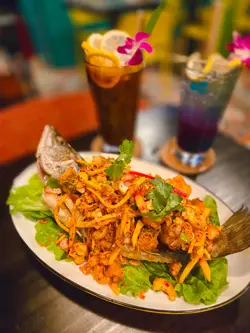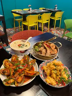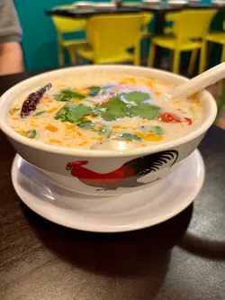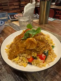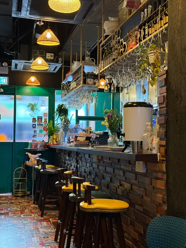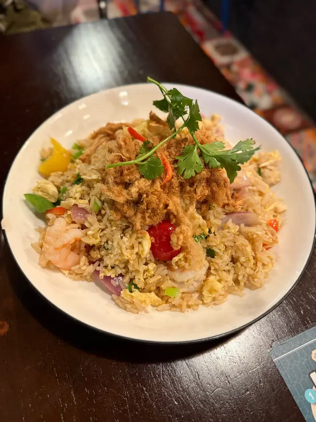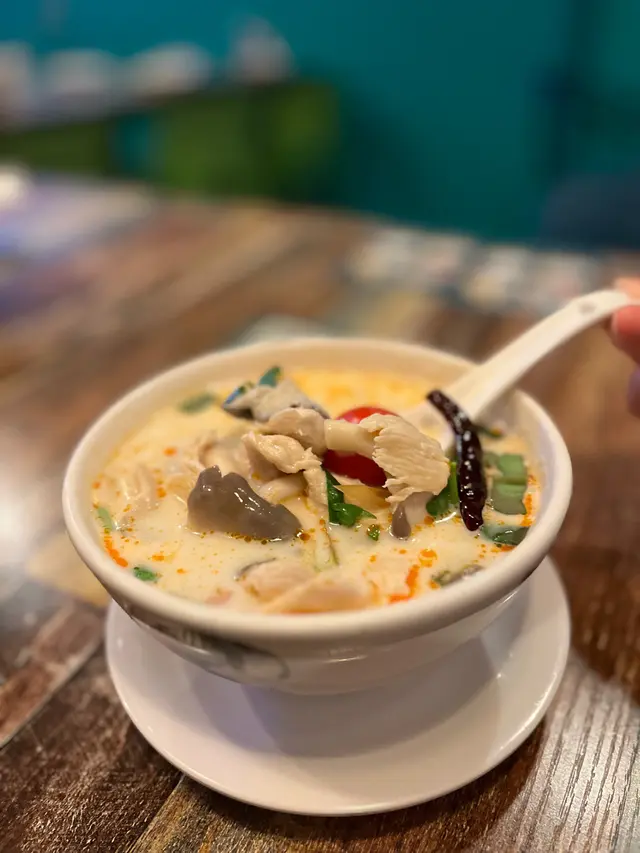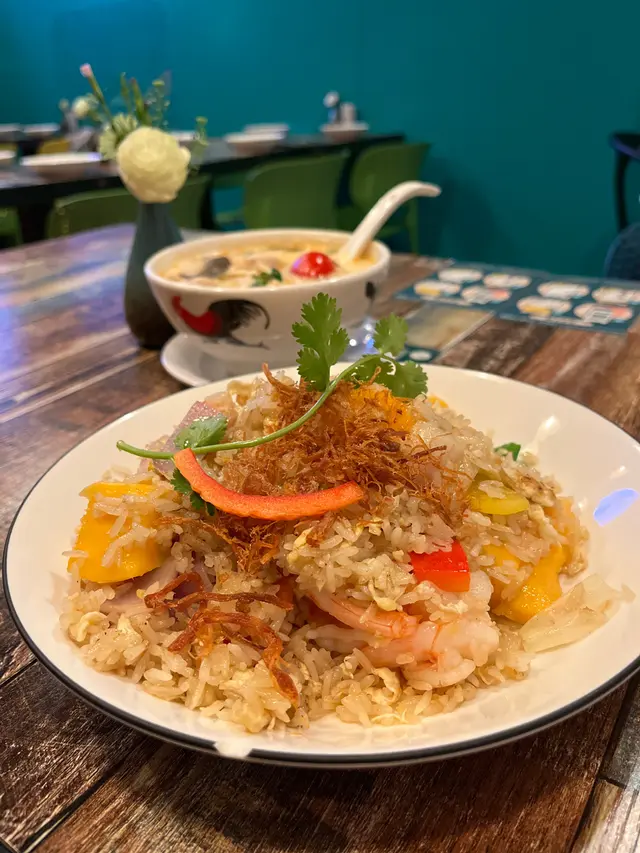 天氣涼涼地,真係好適合周圍四出逛下,西環香港大學站附近亦開了不少餐廳,今天逛街時就經過一間綠綠的門面餐廳,餐廳裝修風格非常民族感,打卡非常美感滿滿,而餐廳是一間泰國🇹🇭餐廳。餐廳雖小,但人客滿滿,價錢亦便宜,就一於坐下來休息下,醫飽肚子吧!美食推介:💛蝦醬炒飯:炒飯鑊氣十足,飯粒粒分明,配上新鮮大蝦及肉鬆,甜甜的味道非常香口。💛椰汁雞湯:濃濃的椰汁味道,加上雞肉、香茅、紅辣椒、草菇等等材料煮成,熱辣辣的湯,小小辣,暖笠笠,好好飲😍🤭💛青咖喱豬肉:綠綠的青咖喱汁,配上嫩滑的豬肉及泰式茄子,小小辣,充滿泰式咖喱香味。💛蒜蓉包:烤焗得香香脆脆的多士,鋪滿了滿滿的牛油蒜蓉,超香口。再沾上青咖喱一起吃,超完美配搭🤭👍🏻👍🏻💛炸豬肉條:超香脆的炸豬肉條,外脆內嫩,辣辣地,再沾上醬汁,超好吃😋💛蝦醬炒芥蘭:翠翠綠綠的芥蘭,配以蝦醬炒,非常惹味。*泰式風味十足,份量滿滿。*餐廳招呼周到👍🏻…查看更多