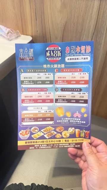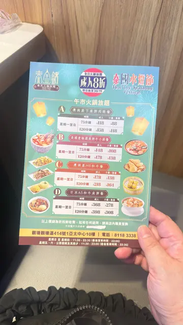 好难得有泰式嘅边炉~我哋拣咗要B餐(美国产极选肩胛牛小排套餐)($298)(其实呢个都仲有其他套餐可以拣:椰浆文昌鸡锅、Gym Gym 自控套餐)拣咗B餐就会包埋会有串烧不得不赞佢哋嘅串烧真系几唔错🫶🏻🫶🏻串烧鸡肉嘅沙嗲味都好浓郁~我自己就特别钟意食串烧鸡软骨😝😝因为真系好脆口咁首先讲咗一人一锅嘅汤底先啦我拣咗要青柠椰奶鸡汤😝😝而我朋友就拣咗要泰金冬荫功锅我觉得两个汤底饮落去都几浓郁😉😉前者饮落去就系甜中带酸嘅感觉后者𠮶个就系会比较有酸辣嘅味道👅 👅之后就讲吓呢个套餐嘅肉类啦美国产极选肩胛牛小排食落去牛肉味比较浓郁🤩🤩极尚牛舌食落去就真系有咬口特选豚梅肉食几烟靭、爽口除此之外佢哋出面亦都有一个海鲜区可以任夹任食我自己就觉得鲍鱼同埋海虾几好食因为真系几新鲜~出面亦都有好多唔同嘅泰式小食可以任拎仲有点心可以拎😱😱我自己觉得𠮶个烧卖几好食当然唔少得一定要饮Thai Milk Tea啦~同埋依家只要以正价惠顾晚市放题A、B、C餐,19:00前离座或 20:30后入座,并以电子货币支付,即享成人8折优惠…查看更多