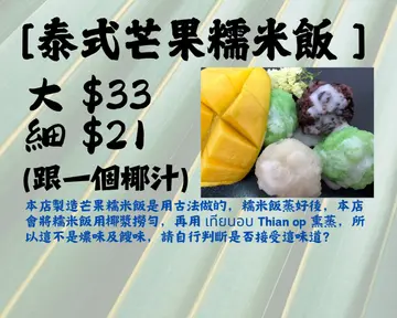 原本谂住上楼上买芒果糯米饭,但系懒行上去,就喺楼下试下呢一间。开咗见到都唔错嘅但系到倒椰汁嘅时候,椰汁好稀,倒到一半见到个椰汁底下系水( 图中𠮶啲系水, 至少有三分一),应该系加咗水落去沟稀, 成本问题定系唔够椰汁???结果原本令到有七分嘅芒果糯米饭得返合格