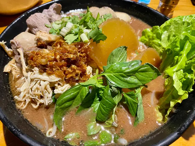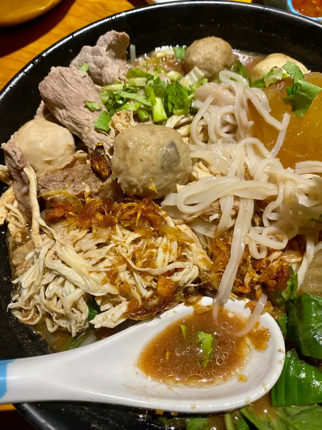 平日晚市來到 店員說也可以去點午市的套餐😙火車頭湯粉 $68 可以自行選擇金邊粉或者河粉 而當晚我則選擇了金邊粉🍜火車頭金邊粉裡面包含非常豐富的材料有牛腩、雞絲、豬肉片、牛丸、豬肉丸、魚蛋、蘿蔔🤪 非常大一碗!湯底非常濃稠 很重口味! 配上香葉、炸蒜、辣椒粉🌶️ 真的無得輸!冬天的時候 吃到這一碗豐富又熱騰騰的湯麵幸福爆燈🌟跟餐加配炸蝦餅2件 (+ $25)上枱時嚇我一條!$25這麼大件!!很抵食!!即叫即炸 外層脆脆的裡面蝦滑的部分爽彈 有蝦味!配上泰式甜酸醬 完美!!!!!其實吃到湯粉、蝦餅和椰青後🦐已經感覺人生的煩惱一掃而空〰️ 無慾無求了然後 泰式燒雞翼便上枱了🤪 $48 (4隻)但是不知什麼緣故 店員給了我五隻🤣感覺也是像炸的 不過沒有關係因為還是好好吃!熱辣辣 外脆裡面juicy! 好吃!!芒果糯米飯 $58太美了吧!兩小球糯米飯團🍙一球是正常的味道 另一球是蝶豆花顏色的💙糯米飯也是熱辣辣的 非常煙韌 有米香配上調校過的椰汁🥥 一絕!硬要挑剔的話,就是有點過甜〰️ 芒果應該是用上水仙芒 🥭 清甜多汁!我一個人吃完上面的主食還能把甜品嗑掉😙大家就能猜到 這是挺好吃的了吧!不知怎的有條毛毛🤣 椰青 (跟餐 + $30)正常味道〰️ 很大一顆〰️餐廳環境是蠻舒適的座位都很寬敞 而且都是沙發質地的椅子☺️餐廳還會一直播放抒情的歐美歌曲〰️食物份量很多 價錢合理挺適合朋友來聚餐的☺️查看更多