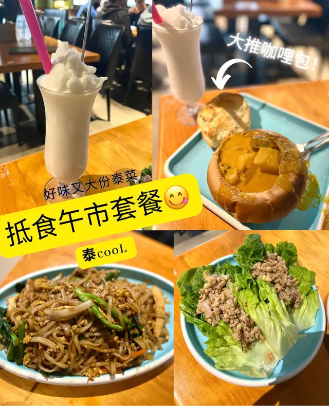 勁抵食午市套餐😋泰COOL午市套餐🍽人均$60-$80 (視乎飲品同加唔加小食)🕰午市時間11:30-17:30 (只接受walk in)午市套餐包主菜加一杯飲品(凍飲同部分特飲需加錢):❤️🍞 巨型包配咖哩牛腩 $58勁勁勁好食!咖哩唔會太辣,牛腩炆得好霖。個巨型包外脆內軟!一級棒!😋相信我會返兜🤣🍝 泰式雞肉炒河 $58性價比極高!間餐廳好多男士去食因為粉同飯個份量都好大!正😋額外追加:🌯肉碎生菜包2件 $10 勁抵食!$5一件,出面冇其他地方搵到,又好食又細細份,過吓口癮😋🧁西米椰汁糕2件 $15椰汁糕用膠兜裝住,比我預期中細,同埋賣相較差🥲有少少美中不足嘅感覺飲品:🧉椰子冰 (+$16)🍹青檸薄荷梳打冰 (+$12)飲品兩杯都大大杯,好飲😋Bible rating: 9/10📍地址:泰COOL (鴻圖道) (觀塘)觀塘鴻圖道48號新榮大廈1樓查看更多