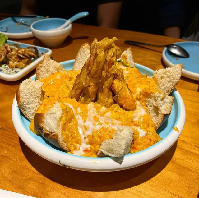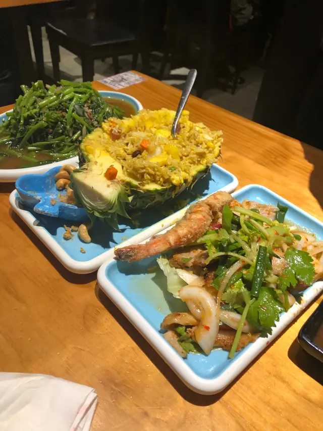 相信大家都唔會陌生 泰cool出名性價比高又係黃店 晚市開返梗係要大大力懲罰!小編表示已經係三刷☺️咖喱軟殼蟹釀焗麵包$178椰汁味同蛋味好重😙相比之下咖喱味就無咁出 軟殼蟹偏林 另外包嘅份量偏多 適合2-3人一齊share 炭燒原隻燒魷魚 $118 炭燒味好香得嚟魷魚好煙韌🤩配埋泰式辣醬真心正 不過覺得魷魚可以再熱啲~香葉爆炒肉碎伴生菜 $88魚露味重但又唔會好咸微辣得嚟又惹味🤤而生菜嘅分量都好夠 唔會話食完仲淨返好多肉碎青胡椒花甲煲 $108整體上唔會太咸 花甲都幾新鮮 不過美中不足係有啲花甲未開曬😗大蝦菠蘿海鮮炒飯 $128海鮮炒飯有大蝦、蝦仁同蠔 炒飯粒粒分明 比較特別係加咗臘腸🤓炭燒豬頸肉 $78好濃炭燒味豬頸肉都好爽口😚不過個人覺得豬頸肉比較夾泰式辣醬多過燒烤醬!芒果糯米飯 $58係熱嘅糯米同紫糯米飯~收加一服務費查看更多