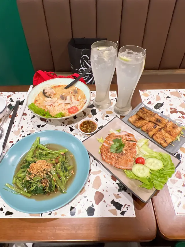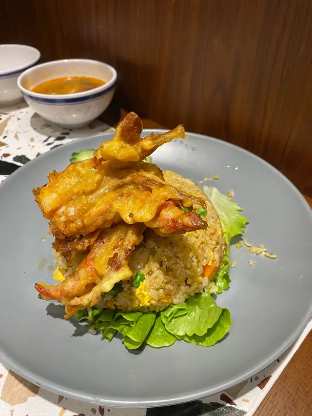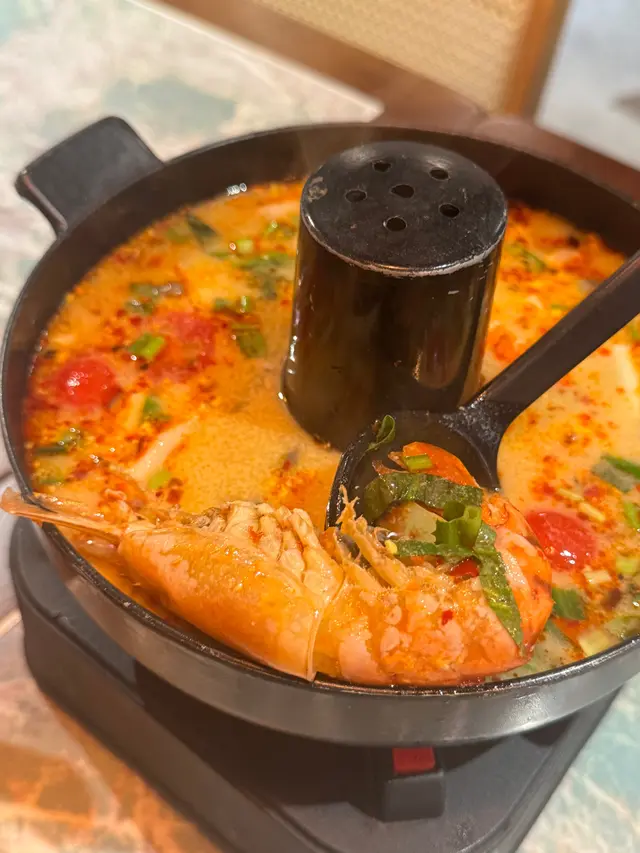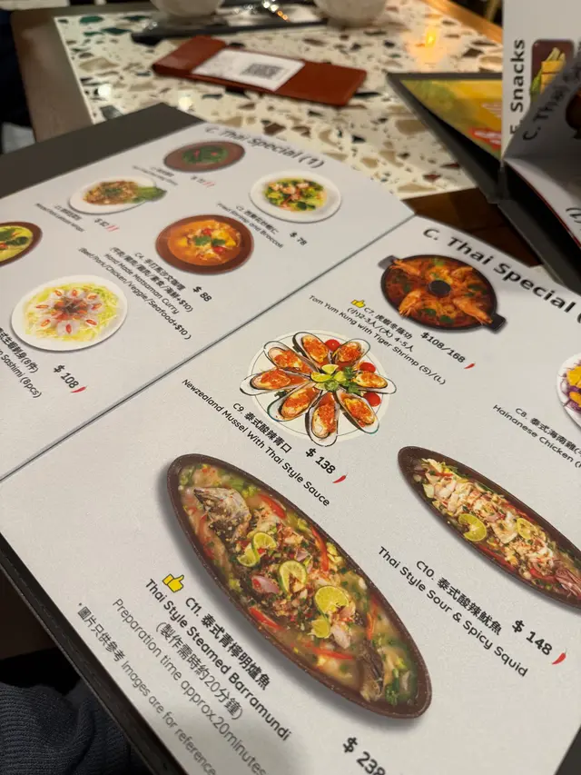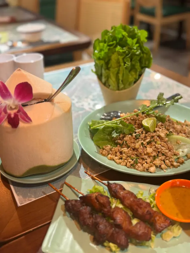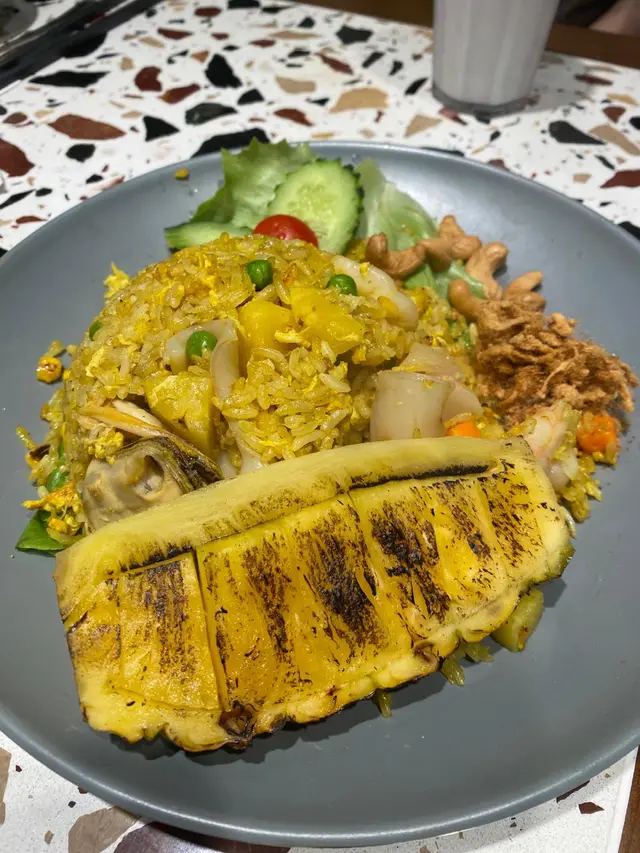 🌸原條菠蘿海鮮炒飯$108🌟🌟🌟🌟🌟原條菠蘿有烤過,菠蘿鮮甜多汁;海鮮炒飯配料有魷魚鬚、魷魚、蝦仁、青口、菠蘿粒、肉鬆、腰果,材料非常豐富,每一口都可以吃到飯及配料。🍀青木瓜沙律🌟🌟🌟🌟酸酸辣辣嘅口感,青木瓜絲非常爽口。🍀粒粒菠蘿梳打加$15🌟🌟🌟🌟滿滿菠蘿粒,底部還有菠蘿糖漿,加入梳打拌勻後滿滿菠蘿香味。🌸牛魔王船麵$85🌟🌟🌟🌟🌟湯底非常濃郁,牛味十足,爽口金邊粉份量十足,爽口彈牙牛丸,滿滿牛肉片重牛味,一口湯一口金邊粉非常惹味。🍀冬陰功湯(細)🌟🌟🌟🌟濃郁冬陰功味,配料有菇菌等等。🍀珍多冰加15🌟🌟🌟🌟🌟濃郁椰奶嘅香味,內裏還有大樹菠蘿絲及綠色粉棵,甜度適中。🌸串燒$88🌟🌟🌟🌟🌟雞牛豬各選兩串,雞肉烤得鮮嫩可口,牛肉烤得非常嫩滑,而且好入味,豬肉也烤得非常出色,每一串都非常可口,再點埋沙嗲醬就更惹味。🌸芒果糯米飯$38🌟🌟🌟🌟🌟鮮甜芒果肉,配搭着熱辣辣糯米飯及紫米飯,倒入椰漿更好味。…查看更多