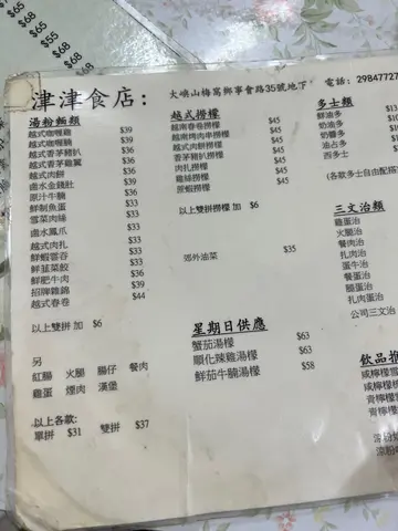 上次行山 愉景湾>>>梅窝 因为平日行, 呢度冇开! 今次再行呢条路专登拣星期日,目的要食呢间津津。成条街D人都系等呢度,烈日当空,大约等左15分受钟。星期日个个都叫蟹茄汤檬,但要拆蟹戴在太麻烦,冇工具地方又唔大,顾唔到咁多嘢,而且有好大旧牛骨,对于唔食牛嘅人就当然唔会考虑。