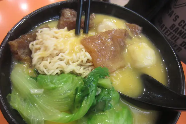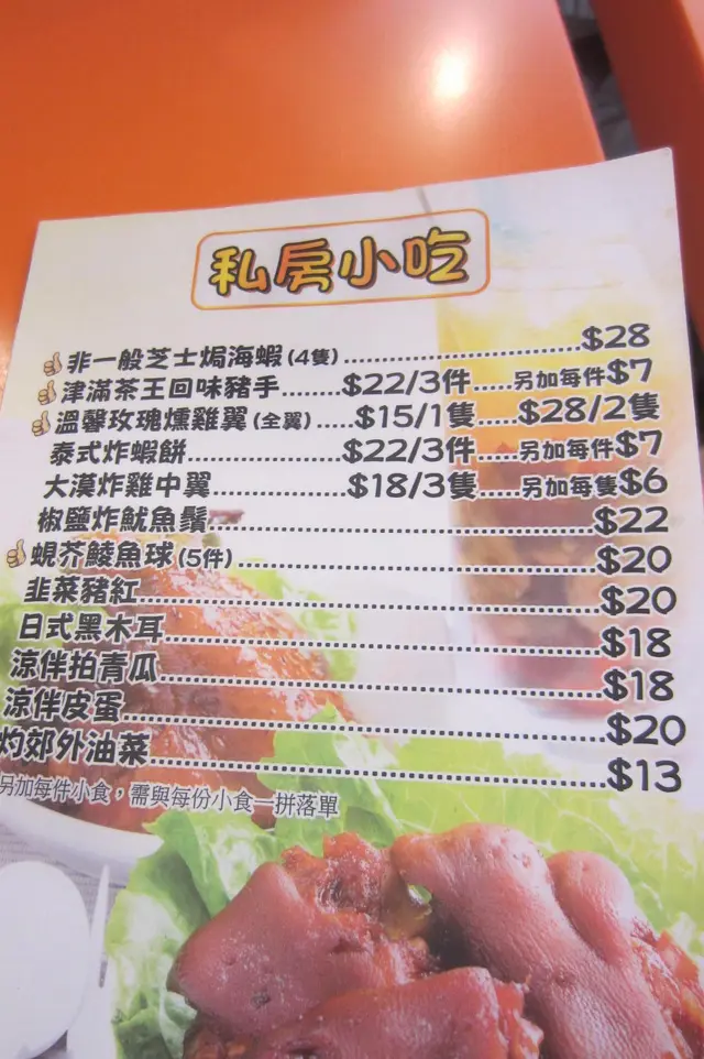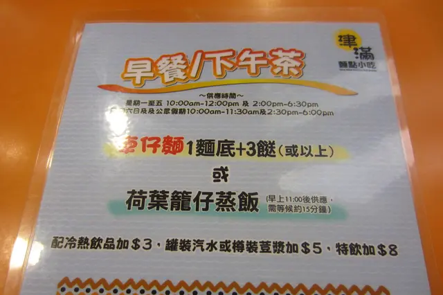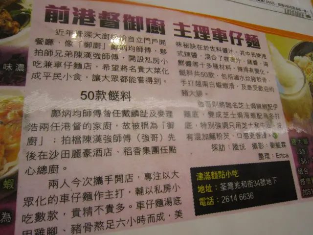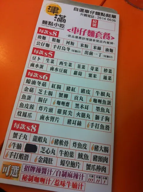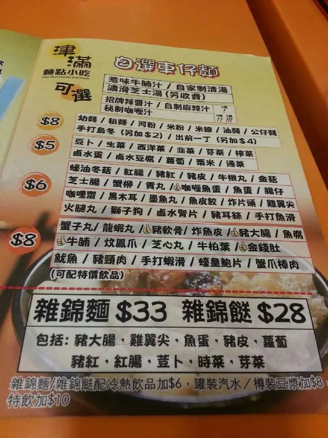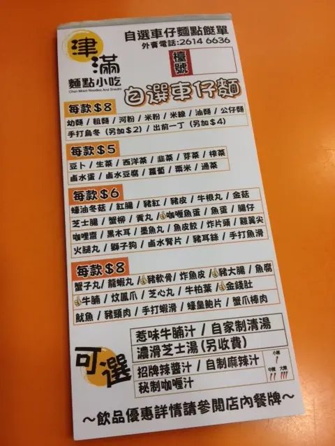 上星期在下刻意去車品品,吃她一個車仔麵餸,另加一些推介食品。今趟去了荃灣,在開心餐廳吃過蛋牛治,卻耳猶未盡,在荃灣遊走一會後,折返兆和街。為什麼會去兆和街?就是在下突然間想起了條街有間小店,專吃麵點和小吃,叫做「津滿」。在下一直都曾經無數次與它擦身而過,不是去了別家食店,就是不想吃車仔麵,今趟既然嚐過車品品的車仔麵餸,為何不可以在這裡吃個車仔麵餸?既然來到門口,從門上的餐牌看,原來以芝士味做一個湯底,還有的是清湯,牛腩汁和秘製咖哩汁,看起來似乎真的好好味咁,就不妨推門入內,就把芝士湯試試看吧!入了去,拿起了車仔麵的紙條,當然點選了蘿蔔魚蛋和紅腸這麼大路的車仔餸,而湯底就來一個芝士味。其實在下既然選定了芝士味的湯底,就索性就不用再點飲品,可是當點選了芝士湯底以後,店員卻說要索價另加十個大洋,無所謂啦。宏觀店舖,牆上貼滿了海報和餐牌,而且佳位全是以橙色做主色,甚為悅目光澤,也使店舖看來也較Sharp。而坐位門也幾寬敞的,坐得也較舒適。車仔麵餸已經上桌,蘿蔔魚蛋和紅腸浸在黃色的芝士湯裡面,而且也散發著芝士的濃郁味道,呷一口湯,實質是很強烈而濃郁的芝士味,而蘿蔔卻未夠腍但卻有咬口,口感甚豐富,可惜有個別蘿蔔不夠新鮮而帶有苦味;紅腸煮得很腍,而邊位卻不夠脆;另外魚蛋亦是很腍,但欠缺彈牙而且有點粉,魚蛋稍為久佳一點。雖然湯底是濃郁的芝士味,但卻也可以嚐到湯底本身也是清湯呢!整體而言,車仔麵餸很腍,但蘿蔔卻不及車品品的那麼清甜與腍,而值得一讚的卻是個湯底,是沒有味精的湯底。服務也不見得很差吧。…查看更多