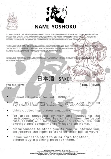 位于上环嘅「浪Nami Yoshoku」居酒屋真系有惊喜!只需要$98清酒无限时任饮,仲要系有几十款超有诚意嘅清酒可以慢慢试,全部都好有质素,餐厅老板仲专业地向我地介绍每款特色,爱酒之人绝对会好enjoy!除左有好酒菜式亦好有心思,结合咗日式同港式嘅fusion风格,食材够新鲜,而且烹调得好好味,完全系超乎预期。第一次去有点难揾,入口隐藏喺商场上一层嘅转角位。小店格局精致,装潢好有风格,营造出温暖舒适嘅氛围。当晚不知不觉得试左接近10款清酒,真正饮饱食醉。✦ 潮式生腌赤贝:赤贝鲜甜爽脆,腌料恰到好处,完美保留海鲜原味,必食!✦ 鲷鱼他他:鲷鱼鲜味十足,酱汁够清新,口感滑溜✦ 蜜饯金蚝:大大只又外脆内嫩,有好浓郁嘅金蚝味,超正!✦ 麻辣墨鱼咀:香辣脆口,墨鱼咀住煮得啱啱好够弹牙,送酒一流✦ 慢煮猪软骨:炆到入心入肺,入口即溶,味道浓郁得来唔会过腻✦ 腊味煲仔饭波:将传统煲仔饭变成精致小食,外层香脆内里软糯,腊味香气十足,好特别呢间绝对系未被发掘嘅宝藏小店,系我会再encore嘅好地方!…查看更多