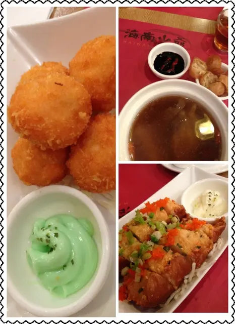 每月一聚,經歷上次南小館趕頭趕尾的一役,大家想吃得既經濟又休閒一點,搞手C就找到世貿的海南少爺。餐廳以喜慶的紅色為主色,裝潢簡約,落地玻璃窗可遠眺維港,樓底又高,空間感極足。枱與枱之間保持一定的距離,方便三五知己或小倆口談心。一行五人甫坐下,侍應先送上兩壺以透明玻璃盛載的茶和一隻鋼耳玻璃杯,幾特別。一呷,是荔枝紅茶,清香中帶有果味,頗具特式﹗整晚侍應都殷勤、主動地加水,每人$5茶錢,眾人心甘情願地奉上。兩小碟糖漬迷你車厘茄,甜甜的,幾開胃。挾了一粒品嘗,茄肉清甜多汁,冰凍的口感,用來作餐前小吃,絕對是明智之選。片刻,引頸以待的招牌海南雞飯來了﹗侍應用一個長膠盤盛著,有油飯,海南雞,汁醬,雞湯和大白菜。尖長的油飯頗清香,飯粒食落夠乾身爽口而絲毫不會覺得油膩,香茅味突出。惜飯不夠熱且雞味欠乏,似乎不是用雞油來炒的,較為健康,與坊間一般做法截然不同。據聞這裡的飯是用新加坡及泰國進口香米混合,以雞湯加上蒜頭、薑、葱頭、南薑、香茅及斑蘭葉等蒸煮而成。然香茅味蓋過一切,其他香料味道黯然失色。去骨的海南雞雞肉很嫩滑,有7小件,雞味不算濃烈,幸沒有雪藏味或血腥味。皮下脂肪較少,d雞皮薄脆爽口,絕對可以放心地食落肚。海南雞即使不蘸上醬汁,已夠味道。小妹個人則較喜歡蘸上夠甜夠濃夠稠且有陣焦香的黑醬油,薑茸的薑味不夠濃,而自家製微酸的辣醬味道又一般。雞湯用日式茶杯上,奶白濃湯裏有兩粒杞子浮面,湯不夠熱,雞味也不濃。大白菜則夠清淡鮮嫩。海鲜喇沙用料十足且新鲜,有鮮蝦、带子、鱼片、小墨魚、蟹柳、豆卜和溏心蛋﹗一見到橙紅色的湯底,怕辣的小妹已皺眉頭,大感不妙﹗好友C先嚐一口,表示湯底濃郁帶辣且鮮更具椰香,好正。小妹想試喇沙那濃郁香甜而帶刺激的味道,但又怕辣,只好隔去辣湯,淨要米粉及配料。幼滑米粉硬度適中,有嚼勁和咬口。擠出湯汁的豆卜仍殘留少量辣汁,微辣中帶豆香,有嚼口。魚片和小墨魚又滑又彈牙,蟹柳鮮甜,而溏心蛋軟滑富蛋香。雖則走汁,但仍然驚喜連連﹗因新加坡肉骨茶是辣的,故我哋要了一盅帶中藥味的馬來西亞肉骨茶齊品嚐。一打開盅蓋,當歸味撲鼻而來,深褐色而少油的茶內有三件碩大的排骨及不少的杞子。據聞肉骨茶是以大量排骨,再加入當歸、杞子、甘草、八角及北芪等藥材熬製而成。淺嘗一口,藥材味頗濃但不至於嗆喉,入口帶點甘苦。對我這個怕苦的人來說,味道還叫可以。排骨肉質尚算嫩滑,蘸上黑醬油還挺好吃的。油條切片又香又脆,小妹吃得津津有味!夠料、夠鮮、夠脆,豈會有難吃之理?鮮蝦膠打至超級爽滑彈牙,再加鹽巴調味、加蛋白固型,蒸熟了,白裏帶紅點,釀入香脆可口的油條中,美哉鮮哉﹗上面以香脆蔥花和鮮爽蟹籽點綴,下面則墊有脆口炸米通,再加一小碟酸甜沙律醬,混合一齊同吃,啪作響,口感豐富,層次多變,好味!粿是閩南語糕的總稱,因加入各種配料而衍生各種食品,如甜粿、鹹甜粿、菜頭粿、草仔粿、芋粿等。菜頭粿,是閩南語,是用硬米磨粉並加上蘿蔔絲混合蒸熟,即粵式蘿蔔糕。食店加了黑甜醬炒香蘿蔔糕,多了一份醬油豆香。上桌前再灑點蔥花點綴,炒糕鹹中帶蘿蔔鮮甜,軟熟蘿蔔絲入口即化,相當美味!令人愛不釋口!兩人分量的木桶斑蘭豆腐花以小型木桶盛載,份量夠五人分享。首次見到嫩綠的豆腐花,頗感驚喜和特別。:)搯一小匙,班蘭味不太突出,奇怪的是,小妹竟嚐到香茅的香味。徒見斑蘭之色,未嚐其味也。豆腐花卻是「嚡口」的,有不少氣泡,一點也不滑嫩,豆味、斑蘭味更欠乏,吃不出有甚麼味來。香茅糖水用碗另外裝著,方便客人自行調校甜度。然而,香茅糖水只有香味,甜味極淡,加了等於白加。創意之作,但對小妹而言,亦是失敗之作也。賣相頗精緻﹗小妹向來嗜吃香口之炸物,即時品嘗了一件。炸漿厚度適中,入口外皮薄薄而酥脆,惜內裡的香蕉過生,帶苦澀味,蕉的香甜未能完全釋放出來。深紅色桂花酒釀糖漿偏稀而甜度不高,桂花的芳香和酒釀的香醇更是不知所蹤了﹗淋在炸蕉上,不但未能讓其味道升華,反而破壞了炸香蕉的香脆口感,頗有多此一舉之感﹗伴碟的士多啤梨和藍莓除了新鮮外,味道也極其清甜。小結:侍應勤快、主動、有禮及細心,服務一流;環境闊落舒適,聚會一流;食物水準頗佳,值得再嚟﹗但最好唔好叫甜品﹗明啦………查看更多
