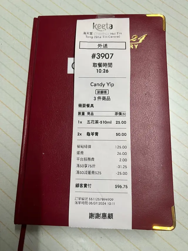 大概10多年前,我已經有這個發現,早兩日食嘢咬到自己嘴唇,唔信邪,冇理到,點知再繼續咬損多兩次,尋晚9:30用美團Apps諗住叫外送,點知已經休息!終於扚起心肝,今朝叫咗兩樽海天堂龜苓膏,因為擔心買太少嘢冇優惠,買多一支五花茶,點知好抵!有七五折,運費$26中減$25,即係收一蚊,全張單$96.75。海天堂龜苓膏比鴻福堂和恭和堂及仁和堂嘅龜苓膏冇咁苦,但係次次我大牙肉腫痛及今次整個口嘅牙肉腫都係食完佢之後4小時就會康復,而且用美團送來屋企食好抵!…查看更多