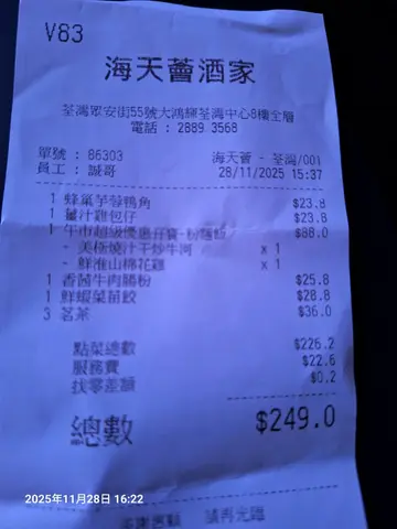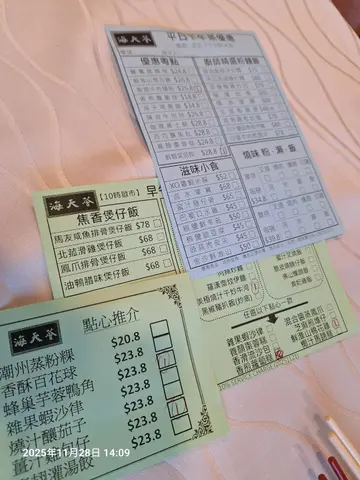早排同朋友约食晚饭,黎咗海天荟,觉得环境装修可以,企理舒适冷气足够。有几样菜系一赞嘅。首先想讲嘅系香酥牛肋条,食得出系功夫菜,牛肋条应该系急冻但都系靓货,卤得够腍够入味,油脂均匀,有牛味。 酥炸功夫唔错,可以讲外脆内腍滑。另一味系山渣拔丝咕噜肉,梅头肉肥瘦适中,有咬口,用真山渣入味,坊间少见,有果香,甜酸味适中,是另一必点菜式。长脚蟹三食,蟹约两斤半,个头唔系很大,但胜在够饱肉,有九成,同新鲜有甜味。豉椒炒蛏子,略贵,但优质!系个四眼著件厨房衫神情带点霸气嘅人介绍。话因为有客人甩底先至有,平时要订。见佢噉落力介绍,同佢要左几只,真心又唔错,蛏子刚好熟,脆口够鲜甜,豉汁味刚好,够镬气。,冇多余嘅芡汁。…查看更多