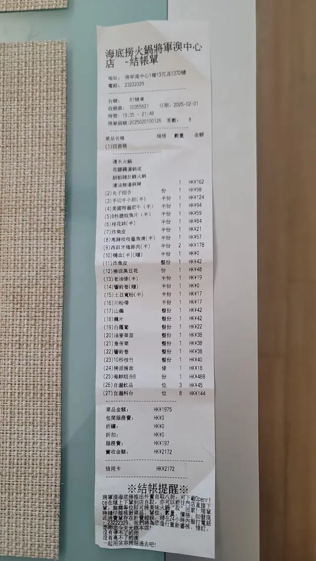 海底撈對我嚟講,係一間好正嘅火鍋,正在係可以自己調配個湯底。4格嘅湯底我淨係一揀一個湯,三個清水。其他三個就跟網上嘅教學而自己調。例如整壽喜鍋湯底,就去調味區攞海鮮味醬4湯匙、陳醋1湯匙、蠔油2湯匙、適量鹽、白糖4包及芹菜1湯匙,再倒回清水鍋,又或者整泰式冬陰功鍋湯底,可以加海鮮味醬1湯匙、芝麻油2湯匙、蠔油2湯匙、芹菜2湯匙、香菜1湯匙、蔥花1湯匙、蒜泥2湯匙、小米辣1湯匙、白糖1包及檸檬3片,玩自製湯底已經夠好玩。撈派脆脆毛肚係必點!爽脆加上自己調製嘅湯底簡直冇得頂;另外一個必點係佢自家嘅大麥拉格啤酒,麥味濃郁,配合個火鍋一齊食完全係perfect。唔知以為係任食!…查看更多