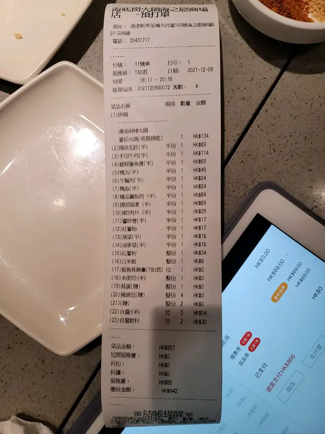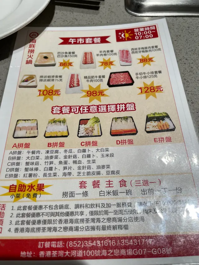 成日返大陆食海底捞,今日第一次响香港食。试吓港版服务有几贴心。😁星期日中午12点前基本上都系唔驶排队,而家经 open rice 订位,下午5点前结账仲有8折。抵㖞!一入座就有萍果+零食礼物包(有瓜子,饭焦,薄脆),好开心呀!自助酱料区,好干净企理,有粥有汤水,虽然冇我钟意食嘅冰粉,但都OK 啦。凉拌菜只有海带、萝卜、鸡脾菇,冇凉拌鱼皮有少少失望。汤底拣咗招牌蕃茄锅,麻辣锅,花胶鸡锅,清水锅。蕃茄锅同深圳一样,服务员会帮客人调一碗牛肉蕃茄汤俾你,老实讲,我好钟意饮,酸酸甜甜,每次都饮3碗。花胶鸡锅就麻麻地,偏咸,鸡肉(1/4只鸡)另上,鸡肉新鲜,唔错。麻辣锅中麻少辣,打边炉刚好。基本上全部食材都落晒去麻辣锅入面。😁火锅料叫咗毛肚,牛栢叶,牛肉,猪肉,豆皮,食材新鲜,好嘛。金桔柠檬水$15 无限添饮,服务员不停加冰,添饮服务我觉得啱啱好,有需要时会主动帮忙,但又唔会打扰到客人倾计。仲会主动介绍优惠,折扣,赠送小礼物。今日食得好开心,下次仲会再嚟。查看更多
