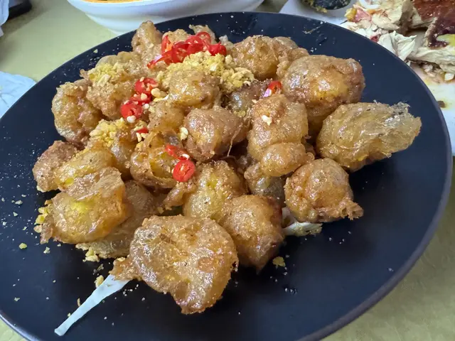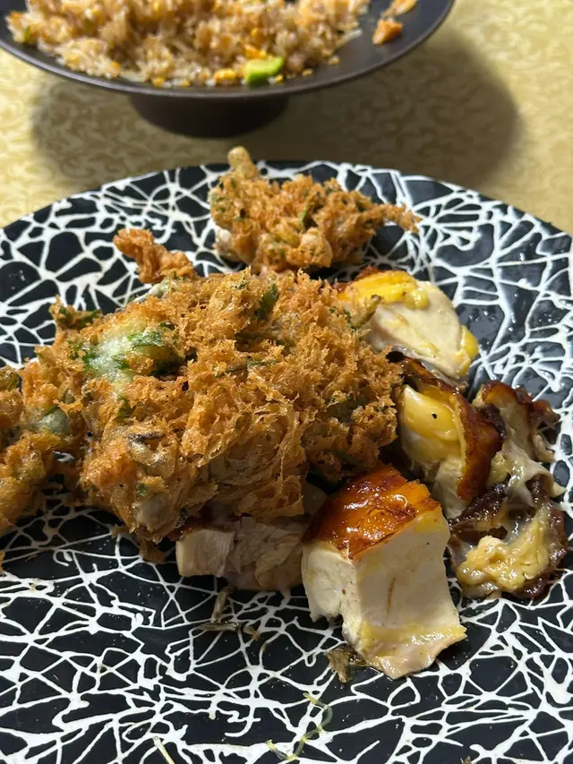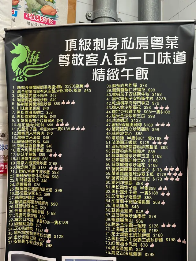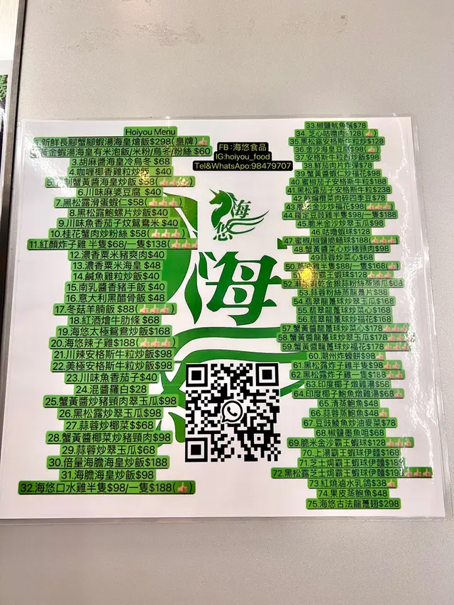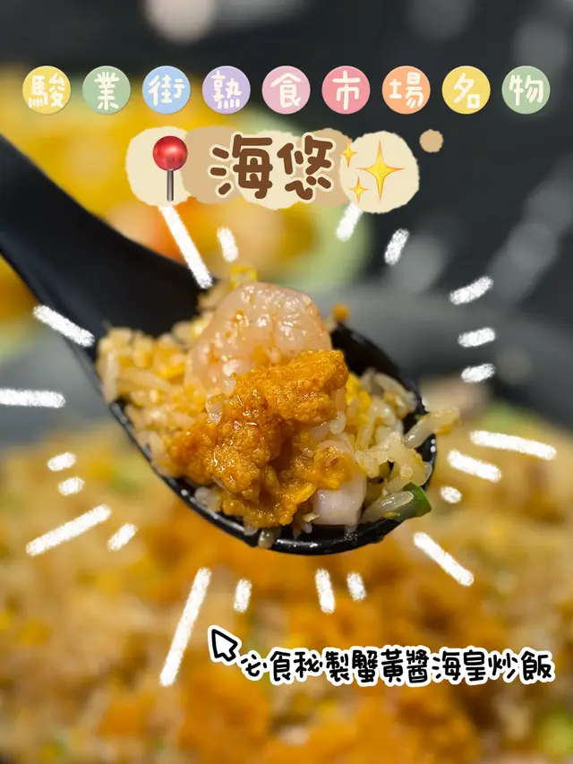 最近看了網絡的飲食介紹, 留意到這間位於駿業熟食市場的海悠, 主要推介他們的炸子雞, 我反而被其秘製蟹黃醬海皇炒飯吸引。是日途經觀塘, 一於在海悠吃晚飯。 海悠在熟食市場有幾個舖位, 均集中在同一條巷內。在走廊走著, 不見一人, 不知自行入座還是需要店員安排, 最後店員突然出現, 安排入座。熟食市場並無冷氣, 在走廊遊走有點酷熱, 可幸的是店內冷氣充足。部份枱舖著膠枱布, 有點油油的, 鄰座一碟碟的小炒和海鮮, 一支支的啤酒, 氣氛高漲, 很有大排檔的氛圍。亮眼點為枱面的 Tempo 紙巾, 是誠意啊。另外落單靠枱面的 QR code, 結賬則自行走到廚房前的收銀處, 很 local。1) 秘製蟹黃醬海皇炒飯 $58 加脆米 $202) 雪碧 $5秘製蟹黃醬海皇炒飯份量不少, 材料豐富, 有翠玉瓜, 蝦仁, 迷你帶子, 魷魚等, 追加的脆米蓋著大量的蟹黃醬, 性價比甚高。炒飯粒粒分明, 乾身, 很有鑊氣。蟹黃醬如鹹蛋黃般, 鹹香惹味。吃著吃著感覺口乾, 遂追加了一罐雪碧。或許份量太多, 竟然出現吃不完的情況, 有點誇張。…查看更多