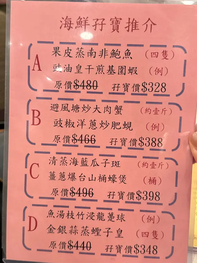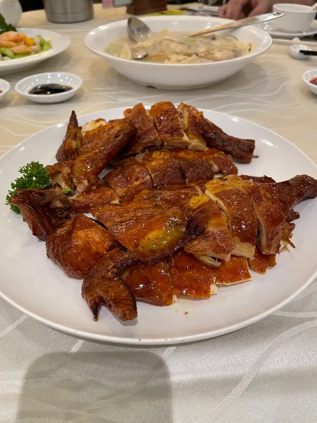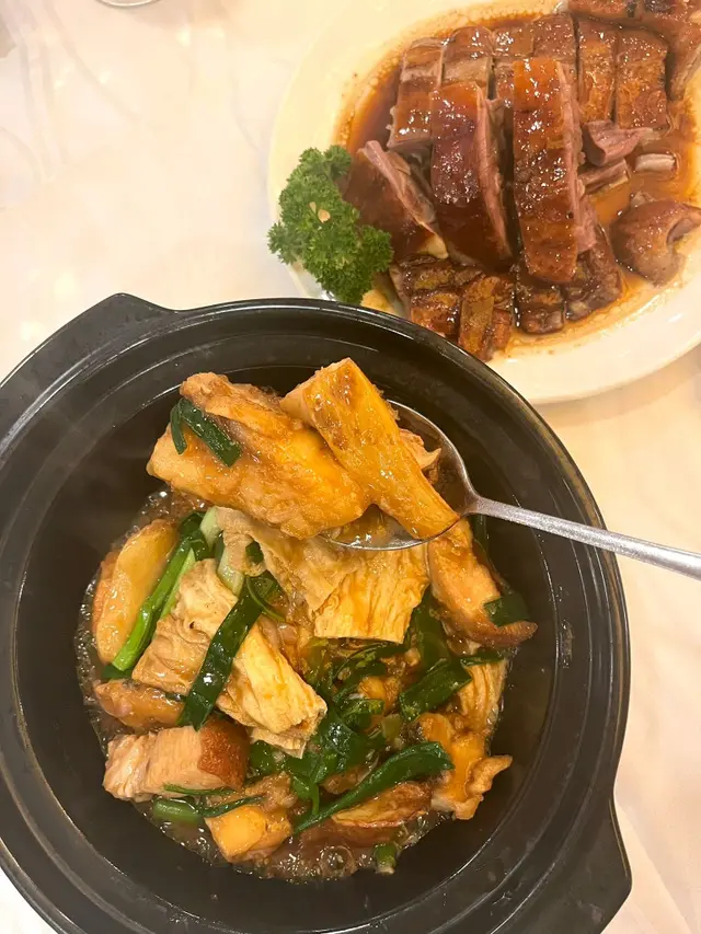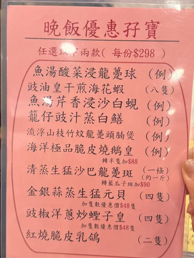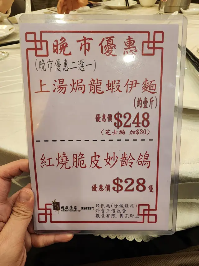 剛好朋友生日, 朋友最愛吃中菜 , 所以帶他去海洋超級漁港晚餐, 中菜館推出晚市套餐,十分抵食, 仲有指定的晚市優惠 , 加上環境舒適 ,交通方便, 與朋友聚餐一個好地方。晚市四人套餐 $788高湯白灼基圍蝦新鮮大隻的基圍蝦,用高湯輕輕灼熟, 可以保留了海鮮的原汁原味,搭配一點醬油, 入口鮮甜彈牙 , 簡單而滋味。錦繡燒味拼盤燒味拼盤有我最喜歡的豉油雞、 燒鴨及叉燒,十分豐富,燒鴨很香脆 、叉燒及豉油雞, 滿滿甜甜的醬油味道,讓人一口接一口。碧綠油泡巨型龍躉球油泡後的巨型龍躉球,外脆內嫩,香氣四溢, 鮮嫩滑溜 ,配搭色彩鮮豔紅、黃椒,口感好清爽。東林扒上素菜色彩繽紛的素菜, 擺盤精緻 , 冬瓜軟嫩, 雲耳爽脆, 西蘭花清脆,搭配薄薄的芡汁提味 ,健康又美味。紅酒燴牛尾煲牛尾經過長時間燉煮,肉質軟嫩入味,吸收了紅酒的濃郁酒香, 色香味俱全, 拌飯一流。流沙包外皮鬆軟, 大口咬下, 緩緩流出金黃的鹹蛋黃餡料, 香甜滑溜,令人驚喜。紅豆椰汁糕入口冰冰涼涼 , QQ彈彈, 啖啖紅豆及椰汁的甜香, 甜而不膩。粉葛豬展老火靚湯老火湯火喉十足,湯頭清潤鮮甜,加上軟腍豬展,清香粉葛, 湯料豐富 ,清熱消暑。炸子雞半隻/晚飯優惠價 $48剛剛炸起的炸子雞 , 香氣四溢, 外皮金黃酥脆,肉質鮮嫩, 沾上特製南乳醬油, 更加惹味 。…查看更多