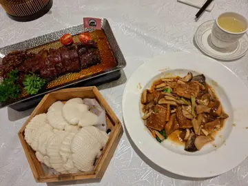 逛旅游展后,顺便在附近晚餐。朋友知道有每斤198阿拉斯加长脚蟹,所以在此癫拿。首先,要选蟹。78两的蟹,接近五斤。<一斤十六两>之前做298,现在优惠是 198,计落每斤节省了一旧水。加上自己屋企未能处理如此巨蟹,唯有在此享用。原只巨蟹,大大只,红彤彤红当当,果真喜庆之色。六脚二钳,全身带刺。以剪刀在柔软的骹位入手,成功拆出长长的蟹脚。剪开蟹脚,成功抽出蟹柳。真蟹肉,一梳梳,够鲜甜,单食已经好好味。除了蟹脚,就连脚趾蟹身也不能放过。蟹钳肉质,不如蟹脚那般鲜甜。甘香的蟹膏,捞饭一流。黑毛猪叉烧 配饼 肥瘦相间的叉烧嫩滑,有底味,玫瑰露酒不明显,易入口。羊肚菌烧豆腐 有豆腐有菇有菌有菜黑松露鲍鱼鸡煲 拆蟹后,鸡煲已放凉。黑松露香气就减弱了!但鲍鱼容易咬,鸡肉唔柴,整体依然好味!可是煲底很多油。田园时蔬~上汤菜心 每餐要食菜,扮健康。今晚无甜品糖水,无水果。埋单每人380个大洋。是日客满,职员很忙碌!服务,心照!…查看更多