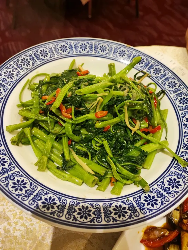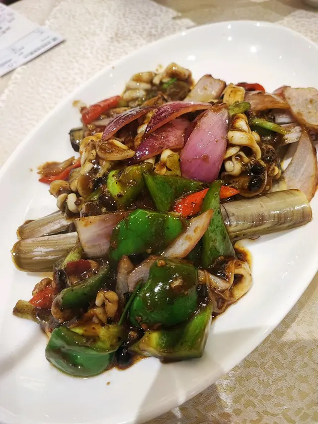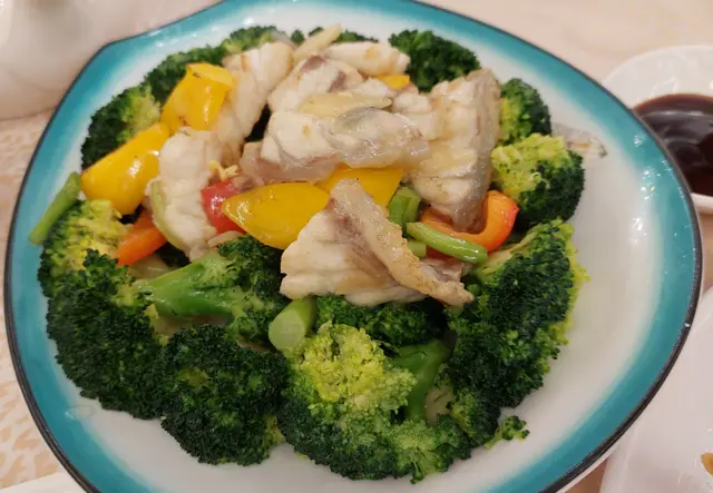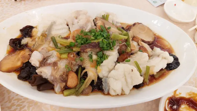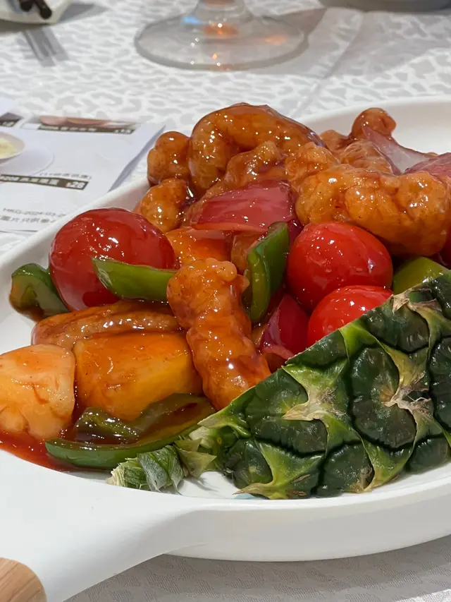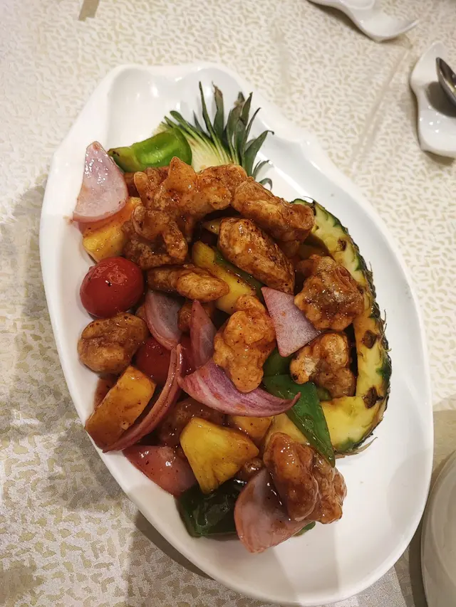 三個人叫咗兩個套餐。生炆龍躉斑翅 其實就係魚鰭位,份量都好大份,三個人好夠食,魚肉都有好多。入面仲有火腩,豆腐干,豆腐,味道唔錯。XO醬西芹炒龍躉扣就咁睇好似豬肚嘅龍躉扣,食落好爽口,扣嘅份量都算係咁,西芹份量好多,當份青菜咁食都唔錯啦。以上兩碟為一份套餐,每份HKD 238新鮮菠蘿咕嚕肉咕嚕肉炸得有啲過火,食落比較硬身。勝在有新鮮菠蘿嘅鮮甜搭救。豉椒炒愛爾蘭蟶子皇大大件蟶子皇,有4隻。但食到有隻有沙。味道炒得都唔錯,唔會話好咸。 椒絲腐乳通菜好耐冇食通菜,通菜好新鮮翠綠,份量都好夠,微微嘅辣味豐富咗腐乳嘅咸香味,好食。以上三碟為一份套餐,每份HKD268整體嚟講用餐感受都唔錯月,係覺得人手唔係好夠,但因為食頭一輪,所以覺得還好,上菜都好快。查看更多