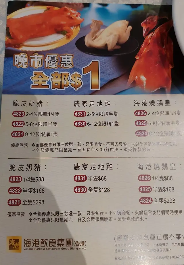 抵食$1餸, 三選一 Kitty Kwong等级12022-07-19636 浏览 关注 上星期一發現樓下間海王漁港, 做$1乳豬/文昌雞/燒鵝, 可以三揀一, 跟著即刻約埋朋友, 係上星期五去食$1一隻乳豬😂, 不過要8人以上, 才有1隻, 2至4人就係例牌, 5至7人就有半隻, 今次約齊8人去試食, 原來真係貨真價實, 送上1隻乳豬仔。見佢今個星期再有優惠, 所以再約朋友係呢個星期五去試$1一隻燒鵝😅, 順帶一提, 呢間d乳鴨都好好味㗎…查看更多以上食记乃用户个人意见 , 并不代表OpenRice之观点。赞好分享抵食$1餸, 三選一 海王漁港 https://s.openrice.com/QrLT0y98Y00检举 张贴 评分4味道4环境3服务4卫生4抵食用餐途径堂食相关食记30日内同一位会员在同一间餐厅提交的食记抵食到冇朋友