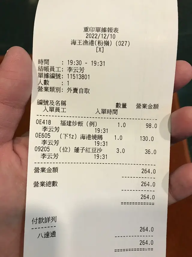 海王漁港驚現惡人收銀員實錄 kcleung731等级12022-12-11874 浏览 关注 本人是此公司長期客戶,於2022年12月10日晚上7:30pm 親往海王漁港(粉嶺綠悠軒分店)購買外賣時發現該收銀員態度極其惡劣!事緣本人向她叫了3項菜,當中一項是紅豆沙,她自言自語很久,我問她是否沒貨,她的回應因為受現場嘈音影響下聽不清楚,但我肯定是不友善的回應。之後,我發現她幫我下了3碗紅豆沙,當時我下單時肯定向她伸出一隻食指及說了要一碗,她亦肯定看到,但無論如何,員工工作太繁忙落錯單絕對可以理解,而我亦不是責怪她此行為,最令我不滿的,是她替我改單後,把2碗紅豆沙的價錢($24)連同單據大力擲在枱面上給我,還責罵我講得不清楚,我當時前後已向2位經理反映,其中一位女經理完全漠視,另一位男經理還好,替我跟她講了幾句。此男經理幫我跟進及親自取外賣拿給我,我很感激。但真正令我憤怒的是,當時我離開前向此收銀員講了一句:請妳以後尊重一下食客。怎料她竟然說已跟我說了不好意思(其實她根本沒有向我說過),又說沒有把退款擲在枱面上,一副推卸過錯和兇惡的樣子!於是我不值她的所為,決定跟她對罵,她的罵聲和態度比我更大更惡,她更說並不是跟我打工。當時全場食客都在注視我們,所有經理走過來都拿她沒辦法,像是她是該店權力最大的一位,我購物那麼多年,無論是任何類型的商店,都未曾遇過上述收銀員的態度,所以我肯定她根本完全不適合勝任此職位!最後,我已向此公司官方網站留言提出去投訴,我並不是需要此公司賠償我什麼損失,我只希望他們盡力改善她的工作態度,如果她仍執迷不悟的話,我懇請他們開除她,因為我不想有更多的食客受傷害!!!補充:上述單據已把3碗紅豆沙更正為1碗,另外,公道來說,此酒家食物質素很好,只是該晚收銀員態度極為惡劣,其他服務員工作態度還可以接受,謝謝。…查看更多以上食记乃用户个人意见 , 并不代表OpenRice之观点。3分享海王漁港驚現惡人收銀員實錄 海王漁港 https://s.openrice.com/QrLT04Un600检举 张贴 评分--味道4环境1服务4卫生--抵食用餐途径外卖自取