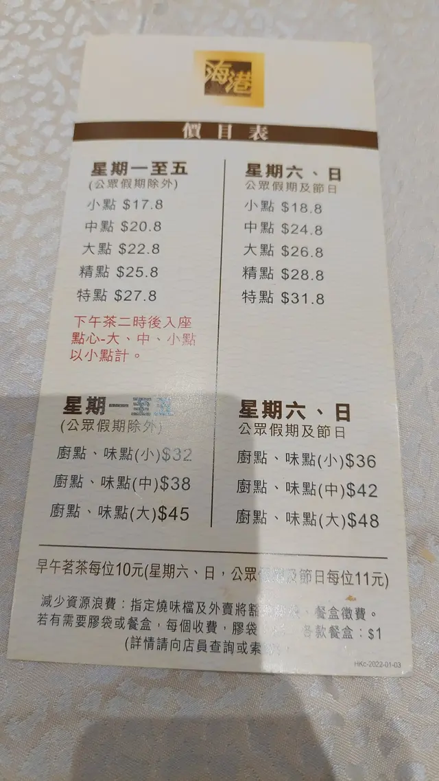 價格上升水準微降 博士等级42022-07-31292 浏览 关注 週未下午茶,2時開始入座,等了約15分鐘,海港飲茶,粉嶺分店二人是要搭枱的,疫情下,不想跟陌生人同桌,加多一位茶錢可以不用搭枱。以前週未、週日都有下午茶,大中小點一律小點,現在改了只限星期一至五。不過另有一張下午茶特價點心紙提供,忘記了影相,價錢尚算便宜二人點了四碟點心香煎蘿蔔糕份量足,有四大件厚切,粉多蘿蔔不多,味道一般百花釀魚肚蝦膠鮮味,魚肚軟腍,油份不算多鳳爪蒸排骨飯蒸飯粒粒分明,排骨醃得入味,鳳爪軟腍蘿蔔千絲酥酥皮太厚,蘿蔔絲少,退步海港會員制可儲分,用100積分,免費送贈一籠蝦餃蝦餃皮厚,蝦肉爽口沒鮮味,味道唔突出。埋單$15X,茶錢$11X3,價錢稍微提升,水準退步中。街坊飲茶,星期一至五下午茶較化算。…查看更多+ 2以上食记乃用户个人意见 , 并不代表OpenRice之观点。赞好分享價格上升水準微降 海王漁港 https://s.openrice.com/QrLT0zIqY00检举 张贴 评分3味道4环境4服务4卫生3抵食用餐日期2022-07-30等候时间15 分钟 (堂食)人均消费$77 (下午茶)相关食记30日内同一位会员在同一间餐厅提交的食记聯和墟覓食之海王漁港外賣聯和墟覓食之街坊開飯任食火鍋
